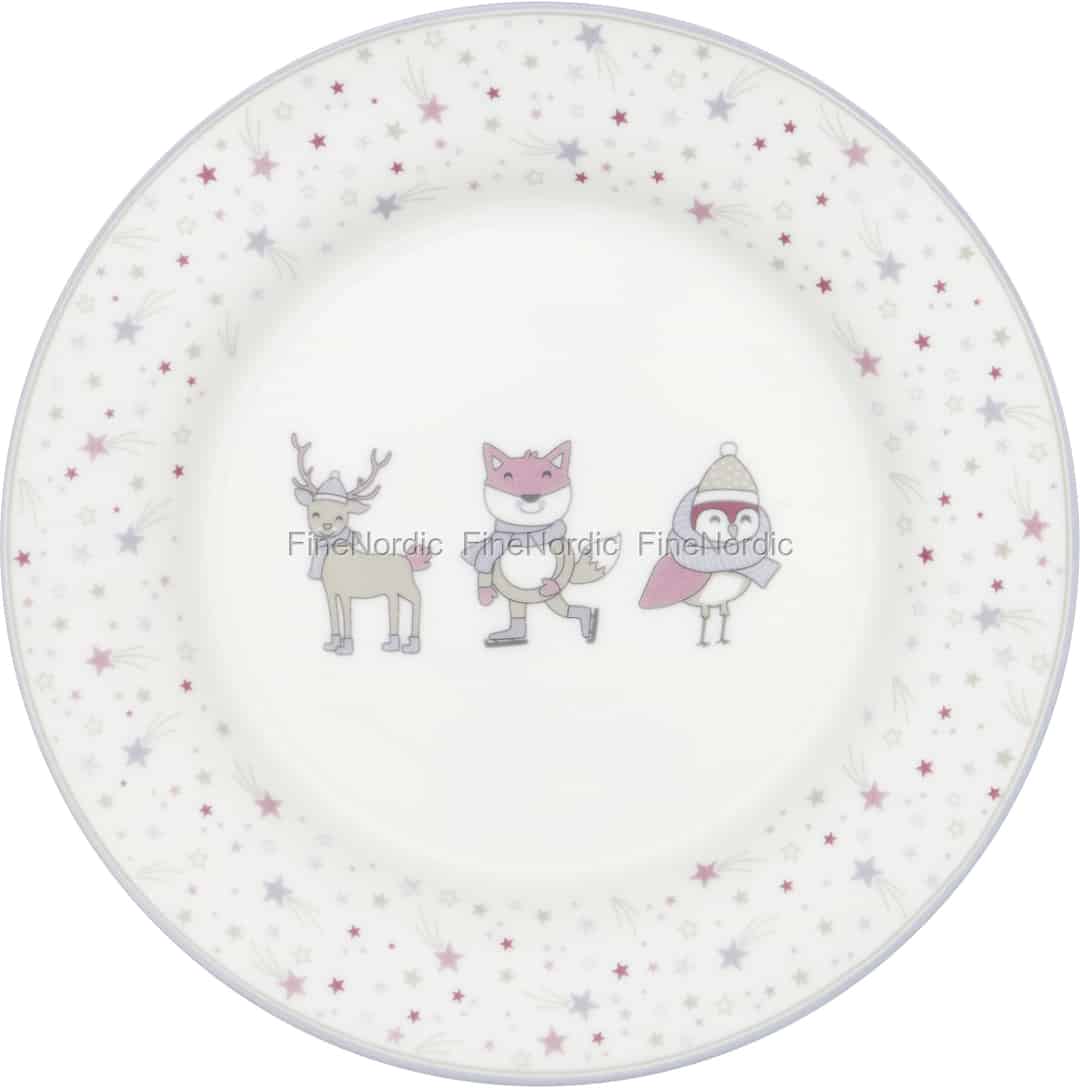 GreenGates Kinderteller Forrest Lavender zeigt ein entzückendes Rentier, einen Fuchs und eine Eule welche Wintermützen und Schals tragen auf seiner Tellermitte. Der Rand des runden Tellers ist mit pastellfarbenen Sternen verziert und ist von zwei verschiedenfarbigen Linien umgeben. Der perfekte Teller für das Frühstück, Mittag- und Abendessen und auch für einen kleinen Happen zwischendurch. Der Porzellanteller ist Teil der niedlichen GreenGate Kinderserie Forrest und kann gut mit dem anderen Forrest Stoneware Produkten kombiniert werden.