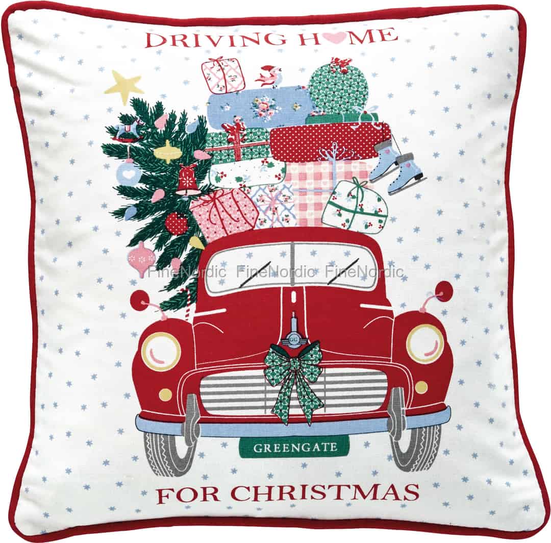 Mit dieser fantastischen Christmas Car Red Kissenhülle von GreenGate können Sie einem Raum ganz einfach etwas Weihnachtsstimmung hinzufügen. Dieser Baumwollkissenbezug ist mit einem alten, roten Auto dekoriert, auf dem Weihnachtsgeschenke und ein Weihnachtsbaum hoch aufgestapelt sind. Wir lieben all die kleinen Details in diesem Print, wie z.B. die Weihnachtsschleife, die den Kühler schmückt und der kleine Vogel mit Weihnachtsmütze, welcher ganz oben auf den Geschenken sitzt. Sie können außerdem auch die Wörter: „Driving home for Christmas“ auf dieser Kissenhülle lesen. Ihr heller Hintergrund ist mit hellblauen Sternen bedeckt und der Kissenrand ist mit einer roten Kante verziert. Sie ist auch ein wunderbares Weihnachtsgeschenk für einen GreenGate Fan.