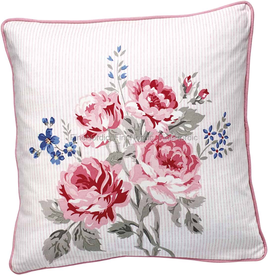 Mit dieser wunderschönen Elisabeth White Kissenhülle von GreenGate können Sie Ihre Couch oder Ihr Bett mit einem bezaubernden Rosenstrauß schmücken. Auf dem quadratischen Kissenbezug fallen die großen Rosen, in verschiedenen Rot- und Rosatönen, ganz besonders auf. Sie werden von niedlichen, kleinen, blauen Blumen umgeben und wir mögen die schönen Farbkombinationen sehr. Der Hintergrund ist weiß und rosa gestreift und ein rosa Rand umrahmt die Kissenhülle. Sie können sie zusammen mit der Elisabeth White Tagesdecke nutzen oder mit der gesteppten Elisabeth White Kissenhülle kombinieren. Entdecken Sie all die schönen Elisabeth White Produkte direkt hier in unserem Webshop. Die passende Kissenfüllung können sie auch separat bei uns erwerben.