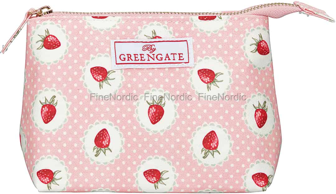 Der kleine, rosafarbene Kosmetikbeutel Strawberry Pale Pink von GreenGate ist mit weißen Pünktchen übersät und zwischendrin sieht man weiße, an der Kante gewellte, Kreise in denen je eine Erdbeere zu sehen ist. Das wohlbekannte GreenGate Label ist auch auf den Beutel genäht und dank des Reißverschlusses ist es auch ganz leicht das Kosmetiktäschchen zu öffnen und zu schließen. Lippenstift, Make-Up, Kajalstift und Co können sicher in ihm aufbewahrt werden und so kann man auch das Allernötigste an Schminkutensilien für eine auswärtige Übernachtung mitnehmen.