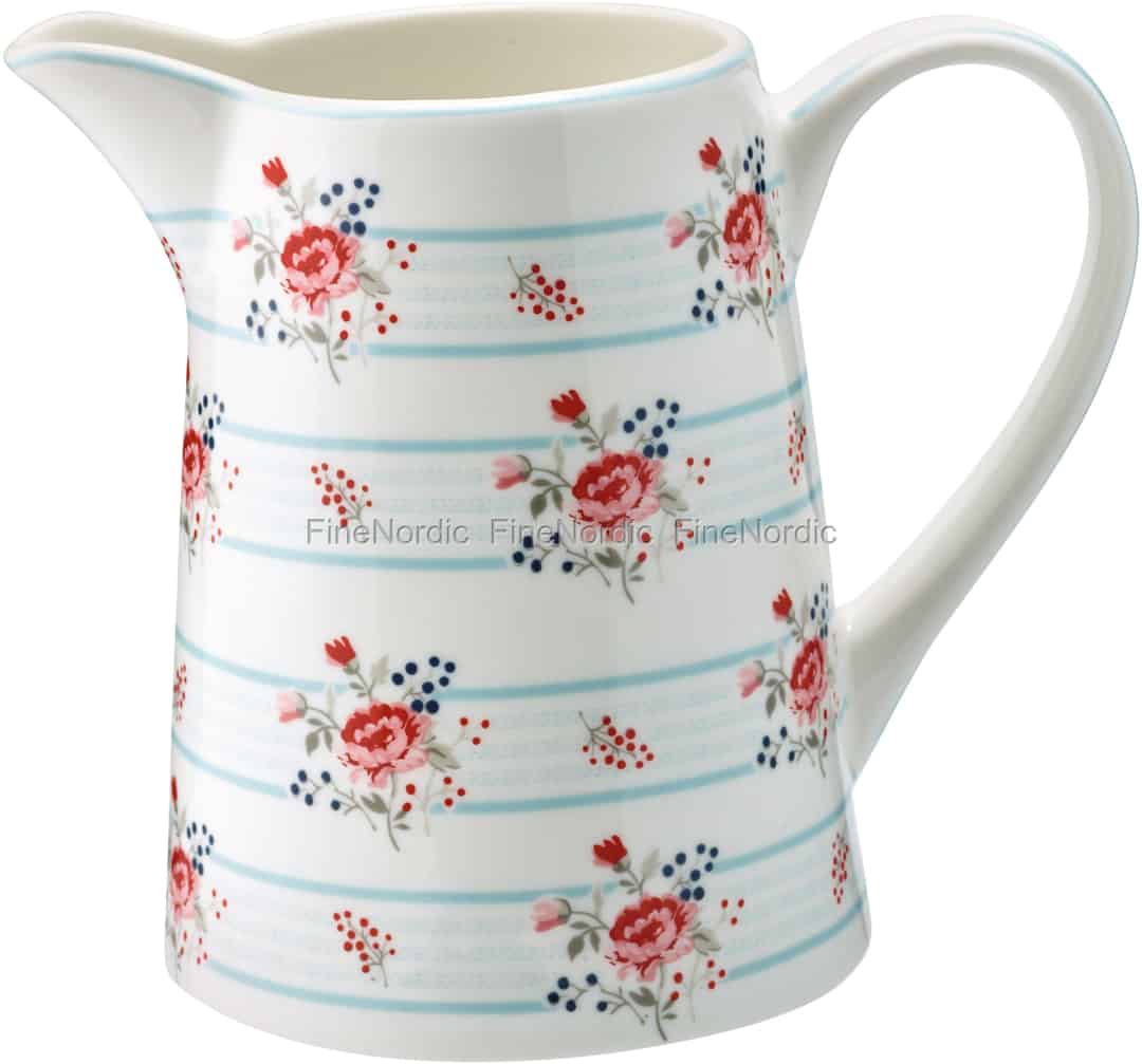 Wir lieben den Fiona Pale Blue Krug von GreenGate! Das klassische Krug Design, die schönen Farbkombinationen und das charmante Blumenmuster auf einem gestreiften Hintergrund machen diesen Krug zu etwas ganz Besonderem. Er ist an seinem großen Griff leicht zu heben und zu tragen und spülmaschinen- und mikrowellenfest ist er auch. Verwenden Sie ihn für Wasser, Milch, Saft und vieles mehr. Sie können dieses schöne Muster auch auf vielen anderen Fiona Pale Blue Produkten finden, wie z.B. Textilien, Boxen und Tabletts. Kombinieren Sie ihn mit den Fiona Pale Pink Artikeln von GreenGate, um so einen noch farbenfroheren und interessanteren Esstisch zu gestalten. Entdecken Sie hier in unserem Webshop die komplette Fiona Serie!