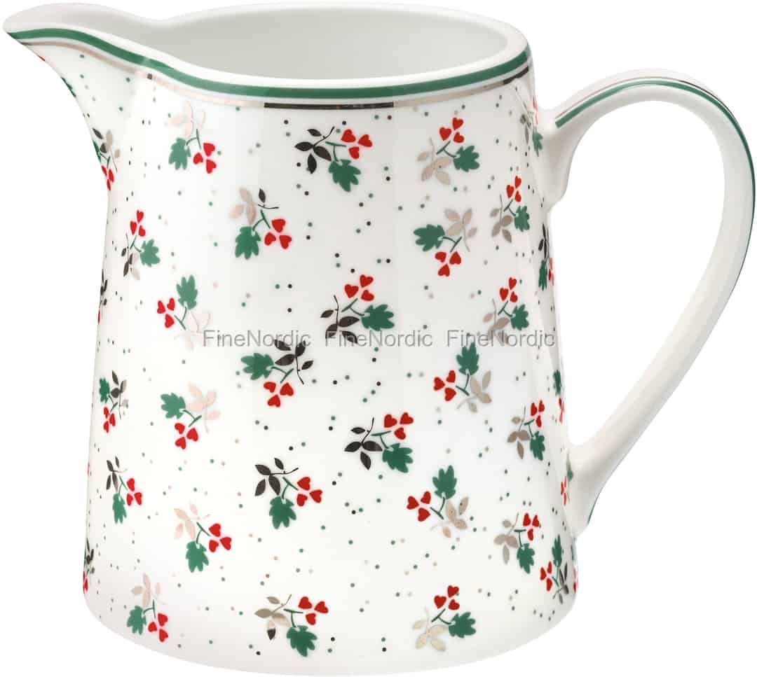 Ein weiteres schönes Produkt aus der Joselyn White Serie von GreenGate ist dieser 0,5 Liter Krug. Wir lieben das Joselyn White Muster mit seinem weihnachtlichen roten und grünen Design. Gießen Sie sich Ihr Lieblingsgetränk aus diesem wunderschönen Krug mit ganz viel Freude in ihr Glas. Wenn Sie den Krug mit dem anderen wunderbaren Joselyn White Geschirr kombinieren, dann werden Ihre Gäste von dem wunderschön gedeckten Tisch beeindruckt sein. Den Krug kann man ganz leicht und einfach an seinem großen Griff halten und er kann auch als provisorische Vase verwendet werden. Schauen Sie sich doch gerne mal all die fantastischen Joselyn White Produkte an, die wir in unserem Webshop anzubieten haben.