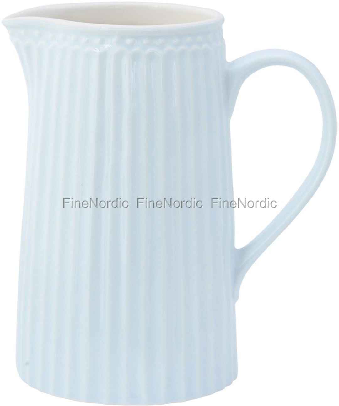 Der hellblaue GreenGate Krug Alice Pale Blue ist ein wahrer Blickfang auf dem Tisch, dank seiner adretten Pastellfarbe und der formschönen Gestaltung der Alice Everyday Kollektion. Das strukturierte Hellblau auf der Außenseite der Kanne sorgt für einen hübschen Kontrast zur hellen, glatten Innenseite des Porzellankrugs. Dank seines großen Henkels und Auslaufs kann man damit das Getränk ganz einfach in ein Glas gießen. Die Alice Krüge von GreenGate können auch gut als Deko genutzt werden. Stellen Sie einen geschmackvollen Blumenstrauß hinein und schon wird der Stoneware Krug zu einem Eyecatcher im Raum.