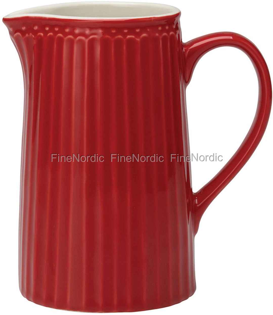 Der rote Alice Red Krug fällt einem sofort ins Auge, dank seines schönen Designs und der kräftigen roten Farbe. Ein tolles Weihnachtsrot schmückt den Henkel und das stilvolle Relief der Außenseite der Kanne, und die helle, glatte Innenseite des Porzellankrugs sorgen für einen schönen Kontrast. Die rote Stoneware Kanne kann gut mit den anderen Geschirrteilen der gleichen Serie kombiniert werden und wir finden die Alice Red Serie bietet sich auch wunderbar als Weihnachtsgeschirr an. Sie können die rote Porzellankanne zum Einschenken von Getränken nutzen und sie kann auch gut als provisorische Vase verwendet werden. Dazu lässt sie sich ganz ausgezeichnet mit Porzellan aus anderen GreenGate Serien kombinieren, denn die Farbe Rot ist in vielen Serien zu finden.