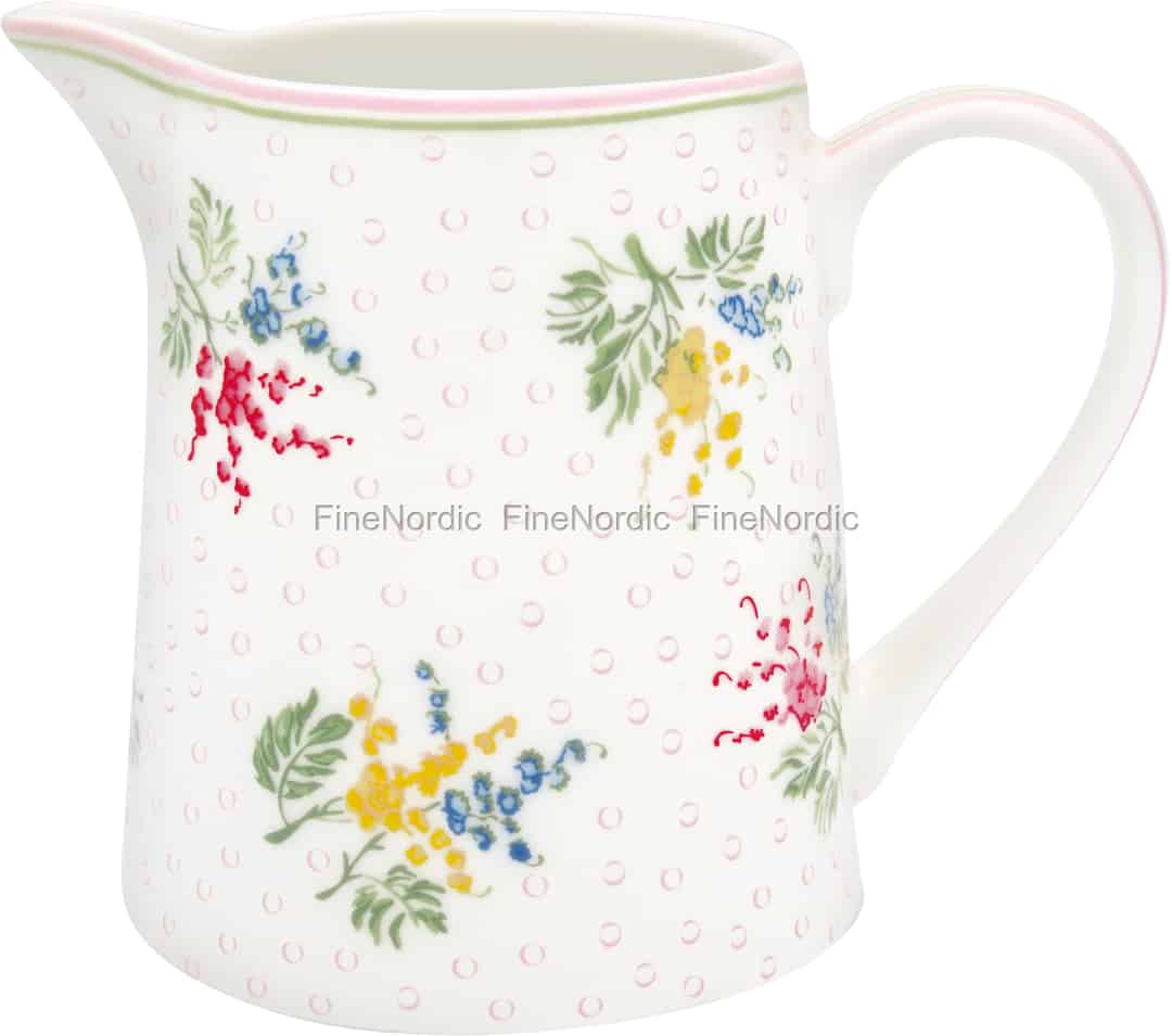 Der Mira White Halbliter Krug ist mit gelben, blauen und roten Blumen geschmückt und sein weißer Hintergrund ist mit hellrosa Kreisen bedeckt. Er ist sowohl spülmaschinen- als auch mikrowellengeeignet. Der Porzellankrug kann zum Servieren von heißen und auch kalten Getränken verwendet werden. Diese kleine Kanne kann auch zu einer provisorischen Vase für ein paar Blumen oder für blühende Zweige werden. Stellen Sie sie damit auf die Mitte des Tisches und schon haben Sie ein schönes Herzstück kreiert. Der Mira White Krug kann gut mit den anderen Mira White Produkten von GreenGate kombiniert werden.