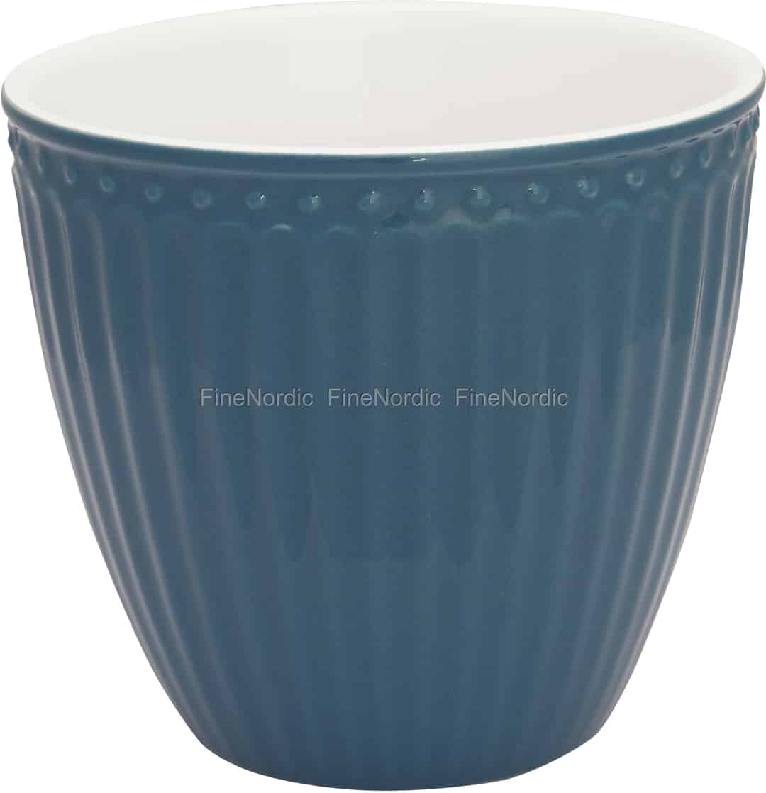 Der GreenGate Latte Cup Alice Ocean Blue zeichnet sich durch sein gerilltes Motiv und seine wunderschöne ozeanblaue Farbe aus. Genießen Sie eine Tasse Kaffee, etwas heiße Schokolade oder aber auch ein kaltes Getränk aus dieser formschönen Tasse. Die henkellose Tasse kann mit der Stoneware aus der Alice Ocean Blue Serie sowie mit vielen anderen gemusterten GreenGate Serien kombiniert werden, da in vielen die Farbe Blau zu finden ist. Die Latte Becher von GreenGate sind sehr beliebt und können auch als Aufbewahrungsmöglichkeit für Kugelschreiber und Bleistifte sowie als kleine Blumentöpfe für Küchenkräuter verwendet werden.