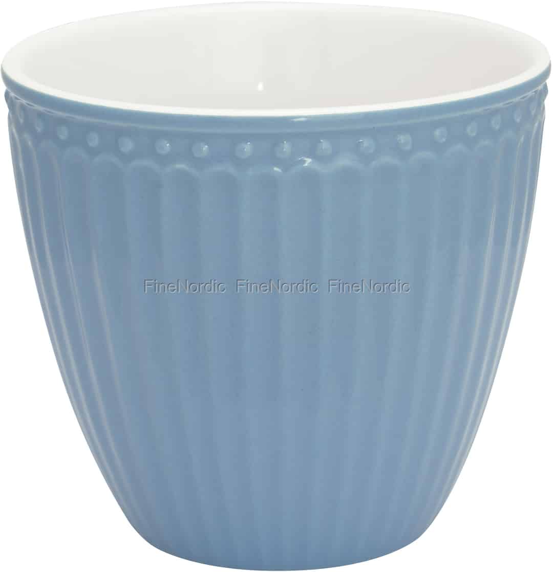 Reliefartige Streifen und Punkte zieren die blaue Außenseite dieses Alice Latte Cups und bieten einen schönen Kontrast zu seiner glatten weißen Innenseite. Die himmelblaue Alice Latte Tasse von GreenGate ist eine weitere wunderbare Ergänzung zu der beliebten Everyday Serie von GreenGate. Kombinieren Sie diese henkellose Tasse mit dem anderen Sky Blue Stoneware von Alice Sky sowie auch andersfarbigen Produkten aus der Alice Serie. Wenn es mit gemustertem GreenGate Geschirr gemischt wird, dann schaut der gedeckte Tisch noch abwechslungsreicher aus.