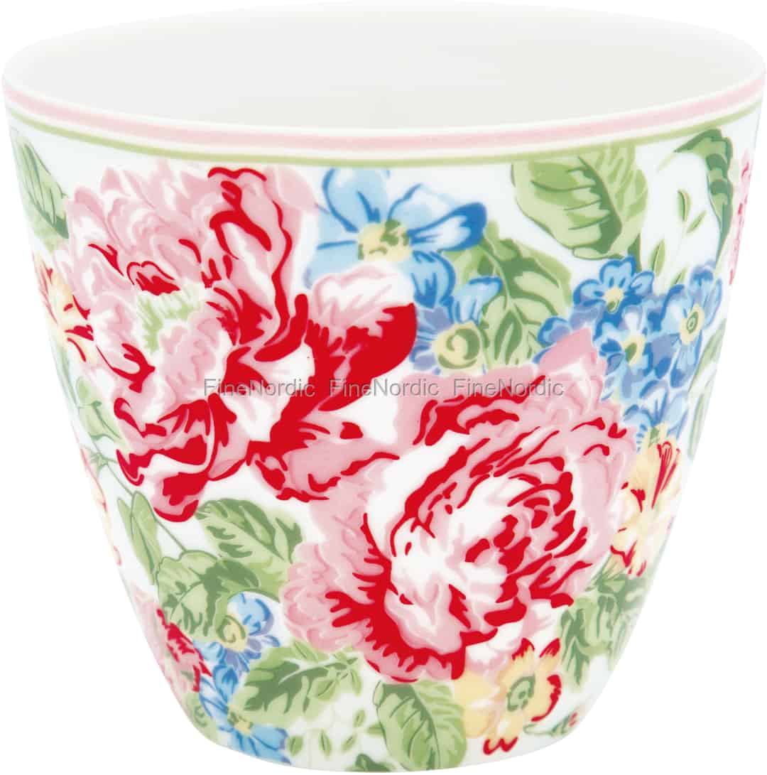 Die Emmaline White Latte Tasse von GreenGate ist mit einem üppigen Blumenmuster bedeckt, das aus roten Rosen und pastellfarbenen Blumen besteht. Sie hat einen rosafarbenen und hellgrünen Rand, während ihre Innenseite schlicht weiß ist. Der gut aussehende Becher kann mit den anderen Emmaline White Geschirrprodukten kombiniert werden und Sie können ihn auch mit Geschirr aus anderen GreenGate Serien mischen. Die henkellose Porzellantasse hat ein Fassungsvermögen von 300 ml und Sie können sowohl heiße als auch kalte Getränke daraus trinken. Sie ist sowohl spülmaschinen- als auch mikrowellengeeignet, was sie sehr praktisch für den täglichen Gebrauch macht. Diese herrliche Emmaline White Latte Tasse sollte bei keiner Latte Cup Sammlung fehlen.