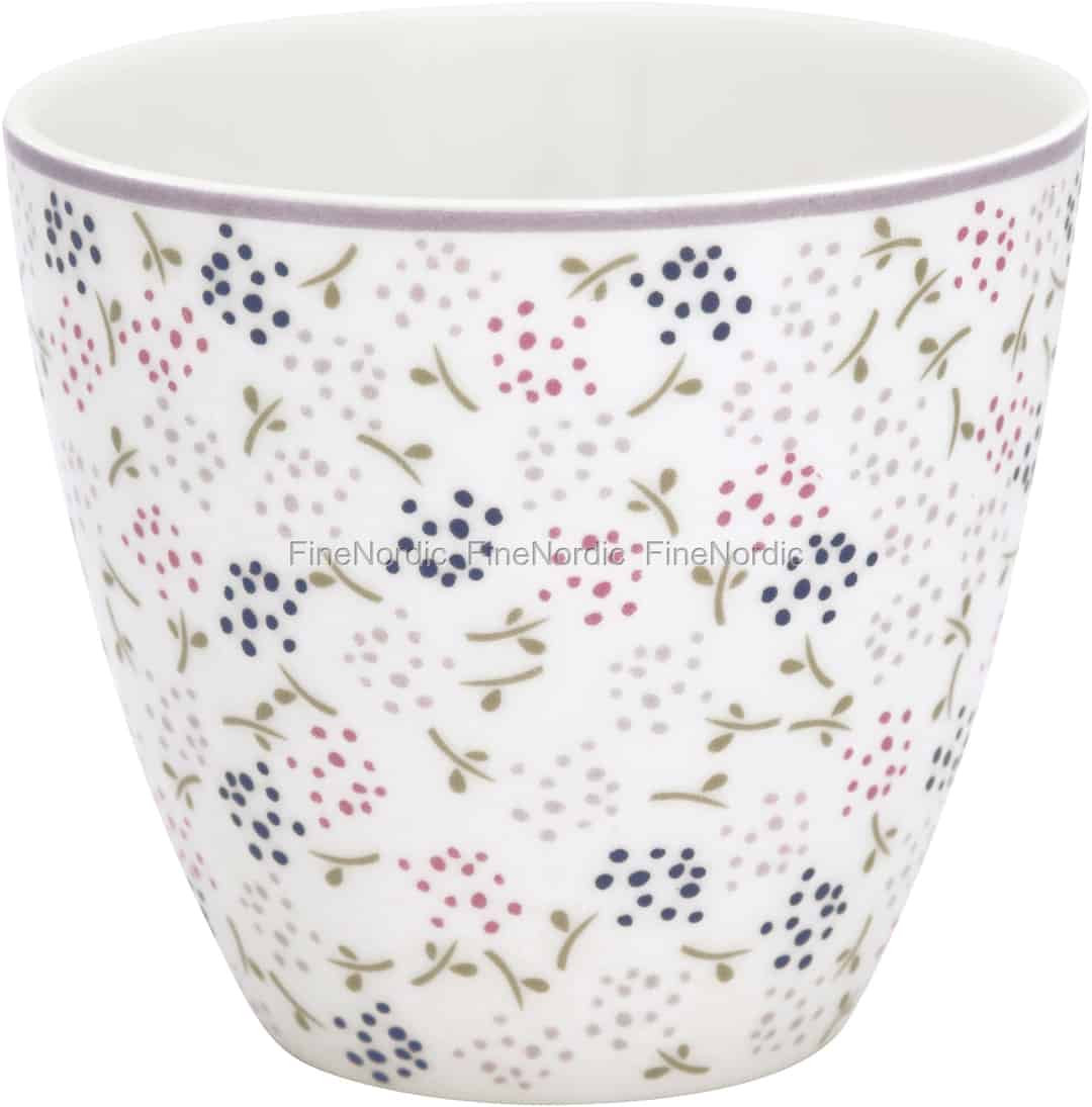 Der Ginny White Latte Cup von GreenGate ist mit einem hübschen Blumenmuster verziert, das aus Stielen und gepunkteten Blüten in verschiedenen Lila- und Rosatönen besteht. Die violette Linie, die den Rand der handlosen Tasse umgibt, verleiht ihr noch den letzten Schliff. Die Ginny White Latte Tasse kann gut mit der Stoneware aus der Beatrice White Serie von GreenGate kombiniert werden. Die Porzellantasse sticht besonders hervor, wenn man sie mit ein paar farblich passenden, musterlosen Geschirrteilen aus der Everyday Alice Serie von GreenGate kombiniert. Die Möglichkeit, dass man die verschiedenen GreenGate Serien so schön kombinieren kann, ist ein Grund dafür, warum GreenGate so beliebt ist.