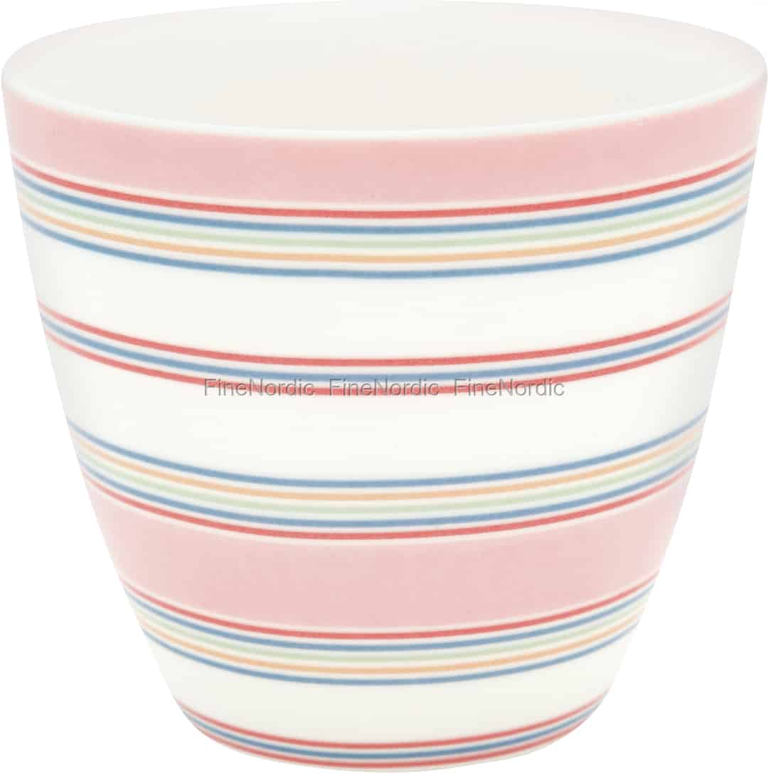 Die Imke Pale Pink Latte Cup von GreenGate zeichnet sich durch ihre fröhlichen Querstreifen und den hübschen Farbkombinationen aus. Die bunte Tasse sieht nicht nur gut aus, sie besteht auch aus hochwertigem Porzellan und kann für mehr als nur als Trinkgefäß verwendet werden. Bewahren Sie Buntstifte oder kleine Büroartikel in dieser henkellosen Tasse auf, verwenden Sie sie als Snackschüssel oder als Übertopf für ein kleines Küchenkraut. Die Porzellantasse hat ein Fassungsvermögen von 300 ml und ist sowohl spülmaschinen- als auch mikrowellengeeignet. Die Latte Cup Tassen von GreenGate sind schon seit geraumer Zeit zu Sammlerstücken geworden, und wir glauben, dass diese gut aussehende Tasse eine echte Bereicherung für jede Latte Cup Sammlung sein wird.