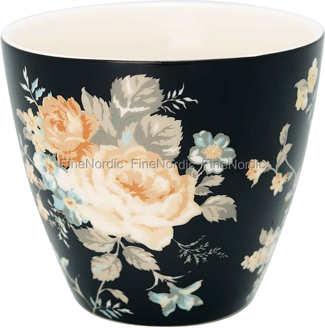 Die schwarze Josephine Black Latte Cup von GreenGate ist mit einem liebevoll gestalteten Blumenmuster geschmückt, dessen helle Farben einen wunderbaren Kontrast zu dem schwarzen Grund bilden. Der Porzellanbecher liegt gut in der Hand und mit ihm kann man einen Kaffee, Tee oder Kakao richtig schön genießen. Die schwarze Latte Cup kann gut mit den anderen Geschirrteilen der Josephine Black Serie kombiniert werden. Schwarze Latte Cups sind ja eher die Ausnahme bei GreenGate, daher sticht diese Stoneware Latte Cup ganz besonders hervor und sollte in keiner GreenGate Latte Cup Sammlung fehlen.
