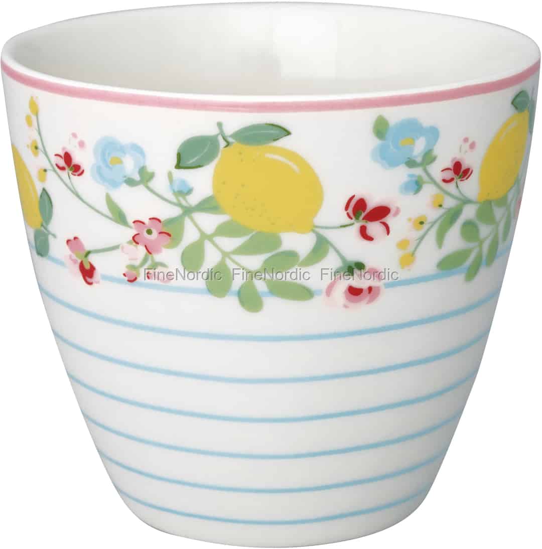 Wenn Ihnen das Leben Zitronen reicht, dann machen Sie einfach Limonade draus! So, oder so ähnlich lautet das Zitat. Der passende Becher für eine erfrischende Zitronenlimonade ist diese Limona White Latte Cup von GreenGate. Natürlich können Sie auch Latte, Milch, Wasser und vieles mehr daraus trinken. Diese gut aussehende Tasse ist mit einem hübschen Zitronenmuster in Pastellfarben verziert. Sie hat ein Fassungsvermögen von 300 ml und ist sowohl spülmaschinen- als auch mikrowellengeeignet. Kombinieren Sie sie mit den anderen Limona White Produkten oder mischen Sie sie mit dem Limona Blue Waren. Schauen Sie sich gerne mal all die sommerlichen Produkte an, die diese Serie anzubieten hat.