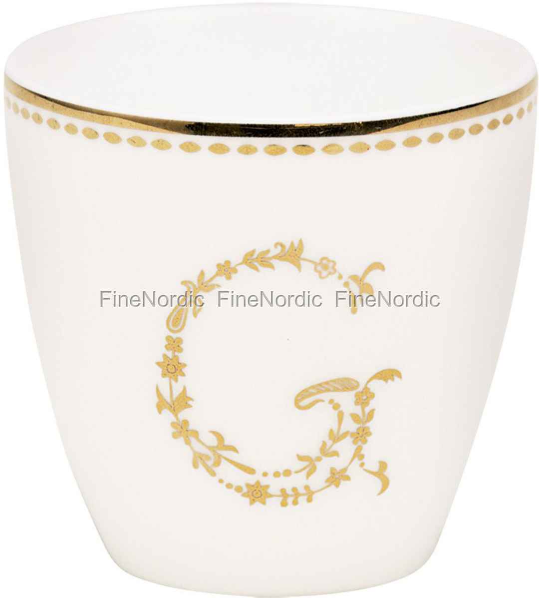 Einen Espresso gefällig? Mit GreenGates Mini Latte Cup G Gold lässt er sich stilvoll genießen. Ein goldenes G aus Blumenranken schmückt in liebevollem Detail die handliche Tasse. Ein charmanter Blickfang auf dem Kaffeetisch.