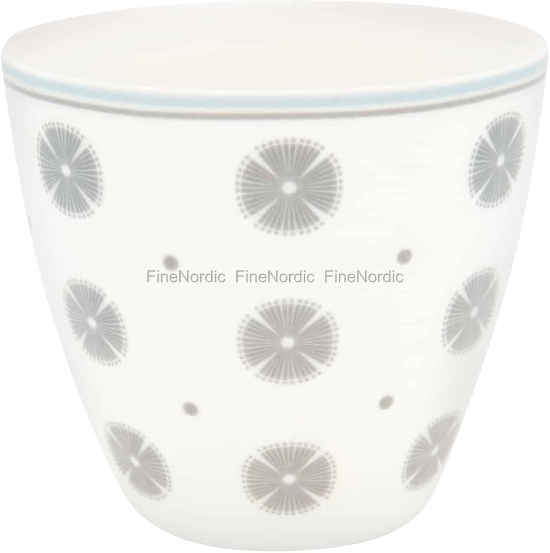 Die Saga White Latte Cup von GreenGate ist mit einem grauen, runden All-Over Print geschmückt und dazwischen sind graue Pünktchen zu sehen. Die obere Kante des cremefarbenen Porzellanbechers wird von je einer hellblauen und einer grauen Linie umkreist. Genießen Sie einen aromatischen Kaffee aus diesem Stoneware Becher, aber auch für andere Heiß- sowie Kaltgetränke kann er genutzt werden. Auch als kleiner Übertopf für ein Küchenkraut oder als Aufbewahrungsbehälter für Stifte, macht er sich fantastisch. Und wenn der kleine grau-weiße Becher dann mit Petersilie oder Kugelschreiber bestückt auf der Küchenzeile steht, dann dient er gleich noch als Deko im Raum. Die hübsche Latte Cup aus GreenGates Saga White Serie kann auch gut mit anderen GreenGate Serien gemischt werden und lässt so den gedeckten Tisch noch interessanter und lebendiger aussehen.