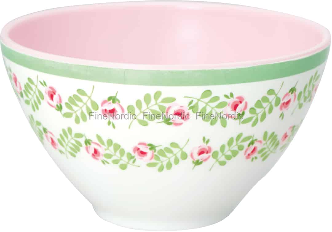 Die Lily Petit White Melaminschüssel von GreenGate hat eine gemusterte Außenseite und eine einfarbige Innenseite. Die Außenseite ist weiß und mit zwei Reihen aus grünen Zweigen und rosa-roten Blüten geschmückt und entlang der oberen Kante läuft ein grüner Streifen. Die Innenseite ist einfarbig Rosa und bietet einen schönen Kontrast zur bunten Außenseite der Schale. Die robuste Melaminschale kann drinnen wie draußen genutzt werden und wenn sie schmutzig ist, kann sie auf der oberen Schiene in der Spülmaschine gereinigt werden. Genießen Sie Ihr Frühstücksmüsli, einen Obstsalat oder vielleicht ein paar Snacks mit dieser schön gestalteten Schale. Sie können die Schüssel auch gut mit den anderen Lily Petit White Waren von GreenGate kombinieren.
