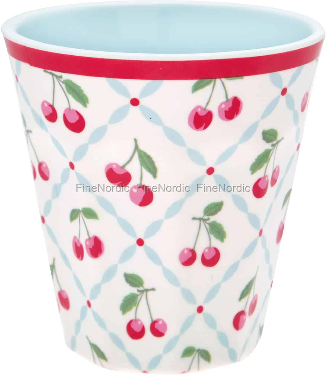 Die Melamintasse Cherie White von GreenGate ist das perfekte Tässchen für den kleinen Durst zwischendurch. Der Melaminbecher ist von außen mit einem hellblauen Rautenmuster geschmückt in dem sich in jedem Feld ein Paar Kirschen befindet. Entlang der oberen Kante, des henkellosen Bechers, verläuft eine rote Linie und die Innenseite des Bechers ist einfarbig hellblau. Servieren Sie Ihrem Kind damit etwas Saft oder Milch oder genießen selbst ein paar Schlucke daraus. Die Cherie White Melamintasse kann gut mit den anderen Cherie White Geschirr kombiniert werden, denn Geschirrteile aus verschiedenen Materialien lassen den gedeckten Tisch noch interessanter und einladender wirken.