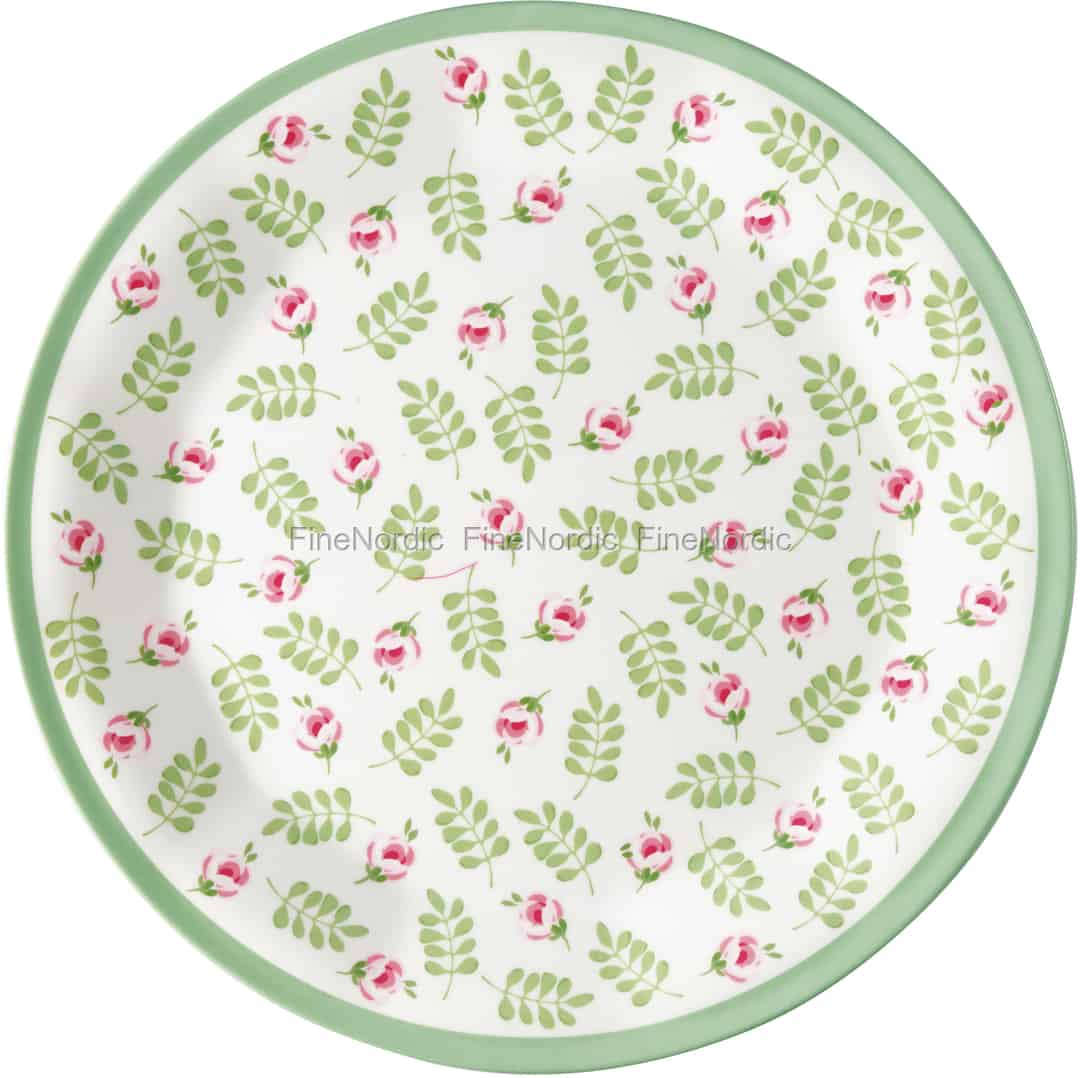 Der helle Oberseite des Lily Petit Melamintellers von GreenGate ist mit hellgrünen blättrigen Zweigen und feinen Blüten in verschiedenen Rottönen geschmückt. Der Tellerrand ist hellgrün und rahmt den Teller sehr schön ein. Der Teller kann zum Frühstück, für ein Stück Kuchen zum Nachmittagskaffee oder aber auch für den kleinen Hunger zwischendurch genutzt werden. Sie können ihn gut mit den anderen Lily Petit White Melaminprodukten kombinieren. Aber auch mit dem Lily Petit Porzellan von GreenGate kann er gemischt werden, denn ein Tafelgedeck bestehend aus verschiedenen Materialen wirkt gleich noch einladender und interessanter.
