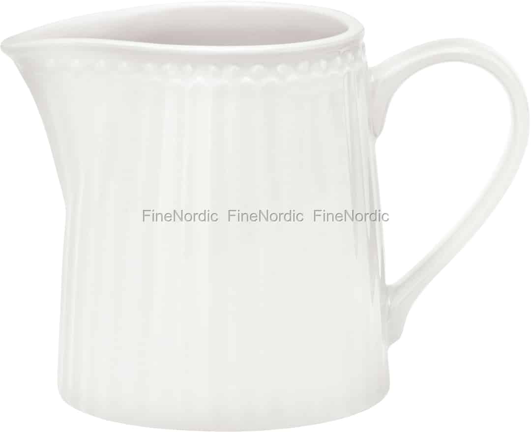 Schauen Sie sich das Alice White Milchkännchen von GreenGate doch gerne mal etwas genauer an. Seine klassische weiße Farbe und sein Punkt- und Streifenrelief machen es zum wahren Blickfang. Der kleine Milchkrug kann gut mit dem Alice White Porzellan sowie mit Stoneware aus anderen GreenGate Serien kombiniert werden. Und wenn er nicht gerade für Kaffeesahne oder Milch verwendet wird, dann bietet es sich auch als ein schönes, provisorisches Väschen für einen kleinen Strauß frischer Blumen an.