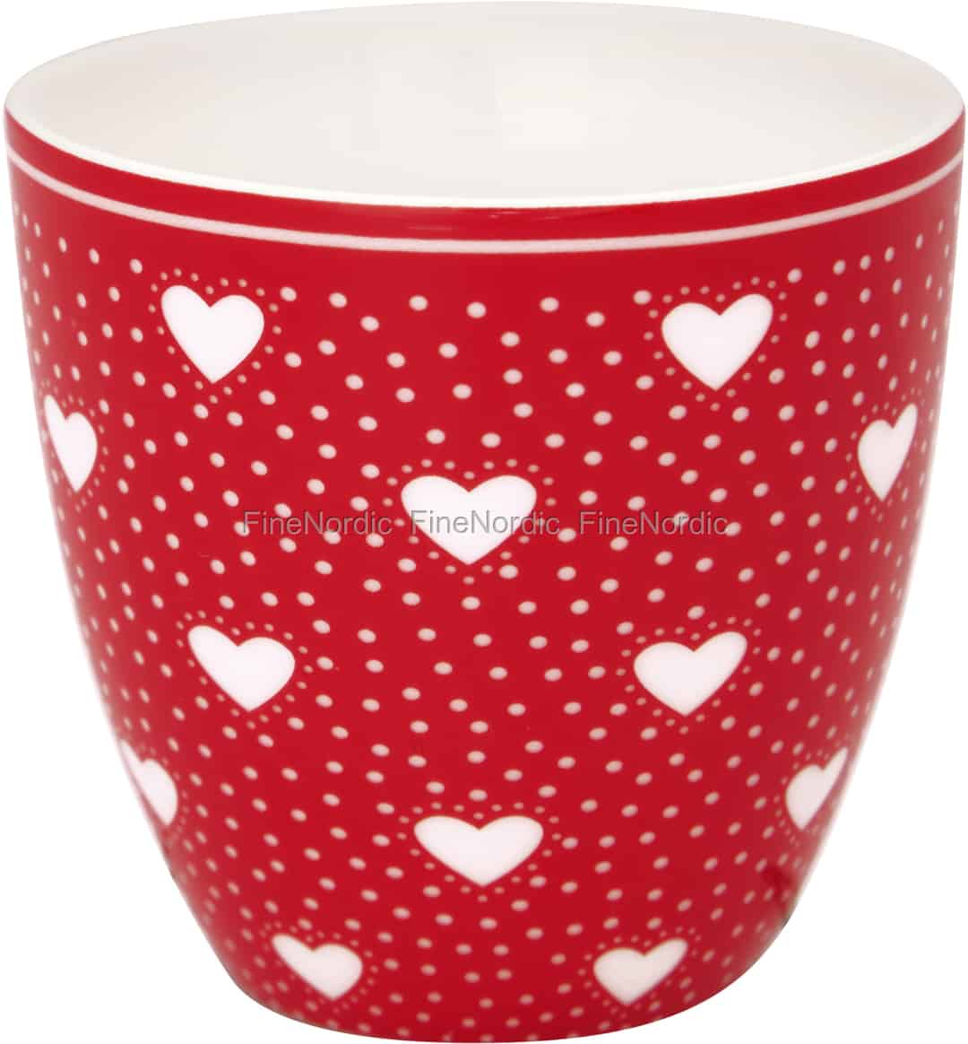 Verleihen Sie dem Tisch eine romantische Atmosphäre mit dieser kleinen, aber sehr bezaubernden, Penny Red Mini Latte Cup von GreenGate. Das Porzellantässchen ist mit weißen Herzen und Punkten auf einem Hintergrund aus einem kräftigen Rot verziert. Die Innenseite dieses henkellosen Tässchens ist schlicht weiß und bietet somit einen schönen Kontrast zur gemusterten Außenseite. Verwenden Sie diesen Stoneware Becher zum Trinken, als Halter für Wachsmalstifte oder andere kleine Gegenstände. Seine weihnachtliche rote Farbe in Kombination mit den hübschen weißen Herzen macht ihn zu einem schönen Weihnachtsgeschenk für einen geliebten Menschen. Sie können ihn auch gut mit Geschirr aus anderen GreenGate Serien kombinieren, da in vielen die Farbe Rot die dominierende Farbe ist.