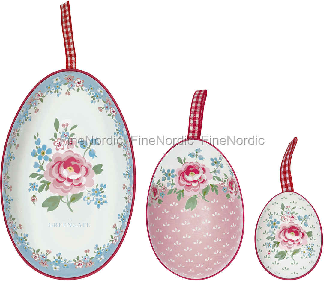 Diese drei Meryl White Eier von GreenGate sind wunderschöne Osterdekorationen. Jedes der drei verschieden großen Ostereiern ist mit einem romantischen, pastellfarbenen Rosenmuster geschmückt. Alle Eier hängen an rot-weiß karierten Bändern und man kann sie alle drei öffnen und ein kleines Geschenk oder eine Überraschung darin verstecken. Sie sind aus Metall gemacht und können als Set aufgehängt werden oder in verschiedenen Räumen separat zur Schau gestellt werden. Dekorieren Sie Ihr Zuhause mit ihnen oder nutzen Sie sie als Ostergeschenk für einen Maileg Fan.