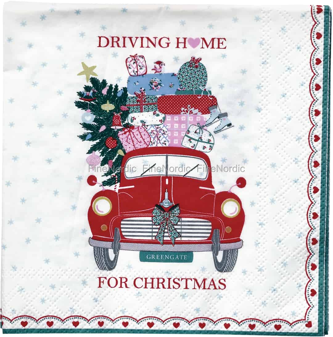 Die perfekten Papierservietten, für die schönste Zeit im Jahr, sind diese witzigen Christmas Car Red Servietten von GreenGate. Wir lieben diese Servietten nicht nur, weil wir beim Lesen der Nachricht "Driving home for Christmas" gleich ein wohliges Bauchgefühl bekommen, sondern auch wegen der vielen kleinen Details im Print. Sie sehen darauf ein rotes, altmodisches Auto mit einem GreenGate Nummernschild, mit einer festlichen Weihnachtsschleife am Kühler und vor allem einen Weihnachtsbaum und eine große Menge Weihnachtsgeschenke, die ganz hoch auf dem Auto aufgestapelt sind. Der Baum ist mit Weihnachtskugeln, Glocken und einem Stern geschmückt, die Geschenke sind in verschiedene Geschenkpapiere eingewickelt und ganz obendrauf sitzt ein Vogel, der eine Weihnachtsmütze trägt. Decken Sie die Weihnachtstafel mit diesen schönen Papierservietten von GreenGate und wir sind sicher, dass Sie gleich zum Gesprächsstoff Ihrer Gäste werden.