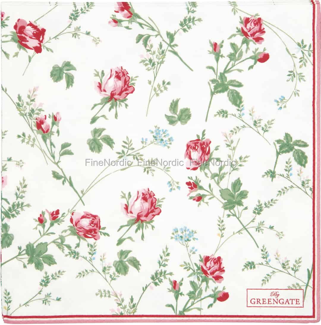 Hübsche Servietten runden einen schön gedeckten Tisch erst so richtig ab. Sie sind ebenso dekorativ wie nützlich, wie zum Beispiel für das Wegwischen von kleinen Kleckereien oder zum Mundabwischen, wenn man fertig gegessen hat. Die Constance White Papierservietten von GreenGate sind mit einem wunderschönen Rosenmuster verziert und werden von einer rosafarbenen und einer roten Linie eingerahmt. Sie werden in einer Packung mit 20 Stück geliefert und können sehr schön mit den Constance White Geschirrprodukten kombiniert werden. Sie können sie auch neben Geschirrteile aus den Alice Serien von GreenGate legen, denn neben dem ungemusterten Porzellan werden sie ganz besonders hervorstechen. Schauen Sie sich gerne mal die große Auswahl an GreenGate Papierservietten an, die wir zur Verfügung haben. Sie finden sie in verschiedenen Farben und zwei verschiedenen Größen, jedoch alle mit einem wunderschönen GreenGate Muster.