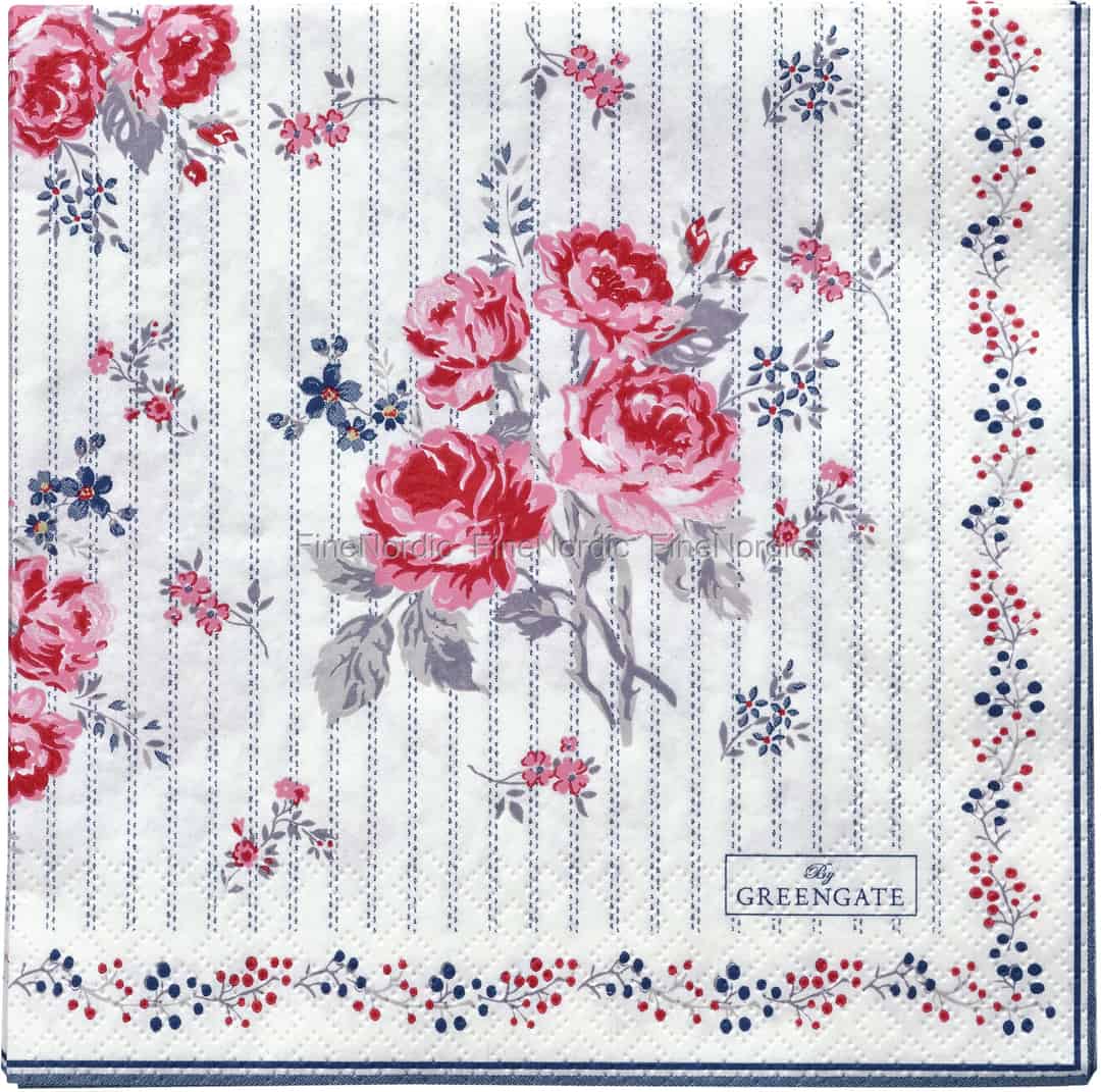 Die Elisabeth White Servietten von GreenGate sind auf dem Tisch willkommen, egal was, wann oder wo. Im Alltag sowie an Feiertagen oder zu anderen festlichen Anlässen, zum Frühstück, Brunch, Mittag- oder Abendessen, im Esszimmer, Wohnzimmer auf der Terrasse oder im Garten, werden diese Servietten den Tisch verschönern. Sie brauchen sich nur mal die Servietten genauer anschauen, mit ihren schönen Blumensträußen auf dem gestreiften Hintergrund und Sie werden sofort zustimmen. Sie werden in 20er-Packs geliefert, sodass Sie immer welche zu Hand haben, wenn vielleicht unerwartete Gäste eintreffen. Können Sie von diesem schönen Muster auch nicht genug bekommen? Dann werfen Sie mal einen Blick auf all die fantastischen Produkte der Elisabeth White Serie. Sie finden sie alle direkt hier in unserem Online-Shop.