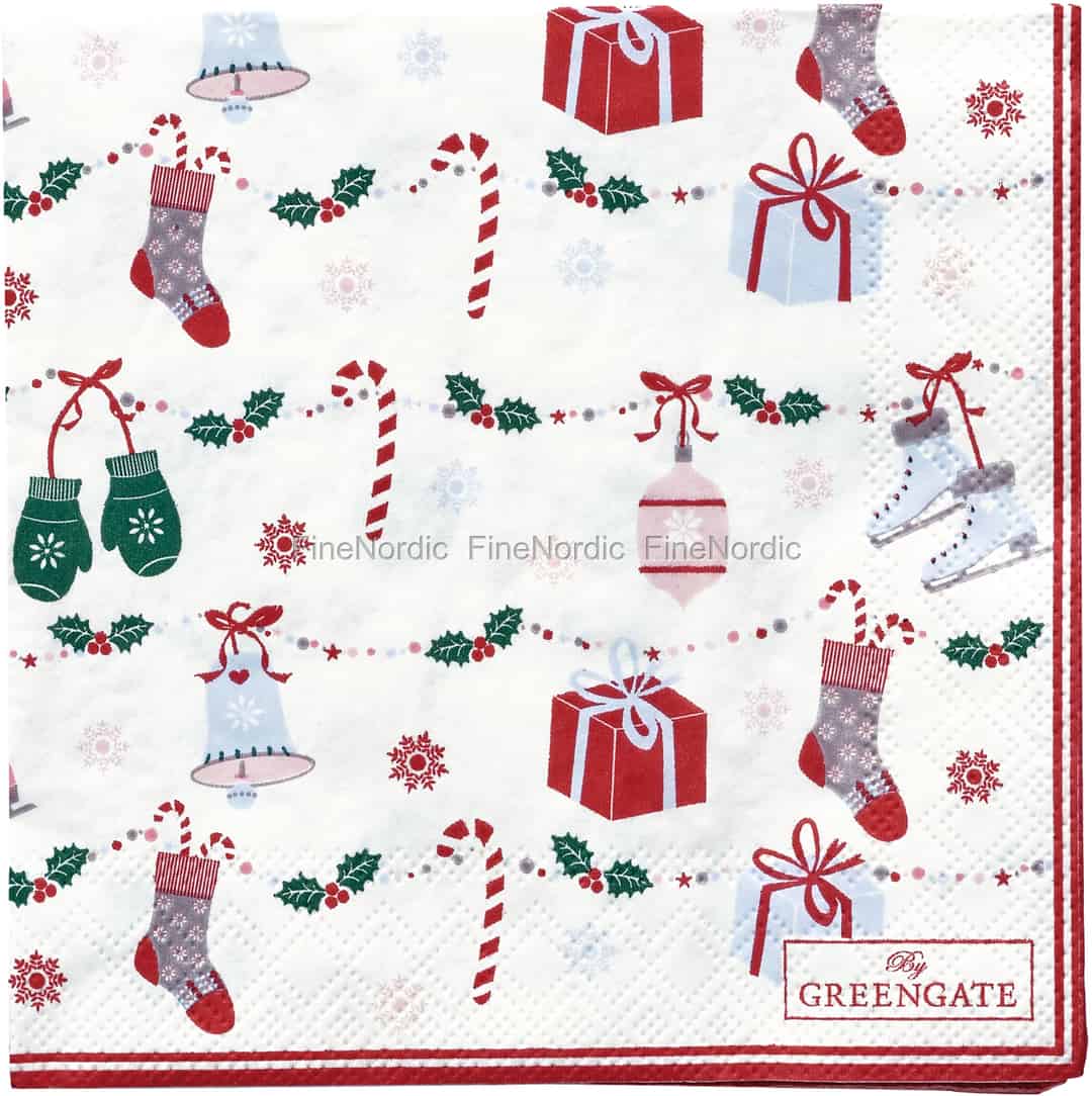 Wir sind einfach so verliebt in diese entzückenden Servietten von GreenGate. Darauf sieht man Girlanden, an denen Schlittschuhe, Fäustlinge, Geschenke und andere weihnachtliche Dinge hängen. Die kleinen Jingle Bell Servietten werden im 20er Pack geliefert und bringen weihnachtliche Stimmung auf den Tisch. Sie sind auch ein schönes Gastgeschenk während der Weihnachtszeit. Wenn Ihnen dieses Muster genauso gut gefällt wie uns, dann möchten Sie vielleicht auch einen Blick auf die anderen fantastischen Jingle Bell Produkte werfen, die wir anbieten. Entdecken Sie in unserem Webshop die charmante Jingle Bell Tasse, Schürze, Grillhandschuh und vieles mehr.