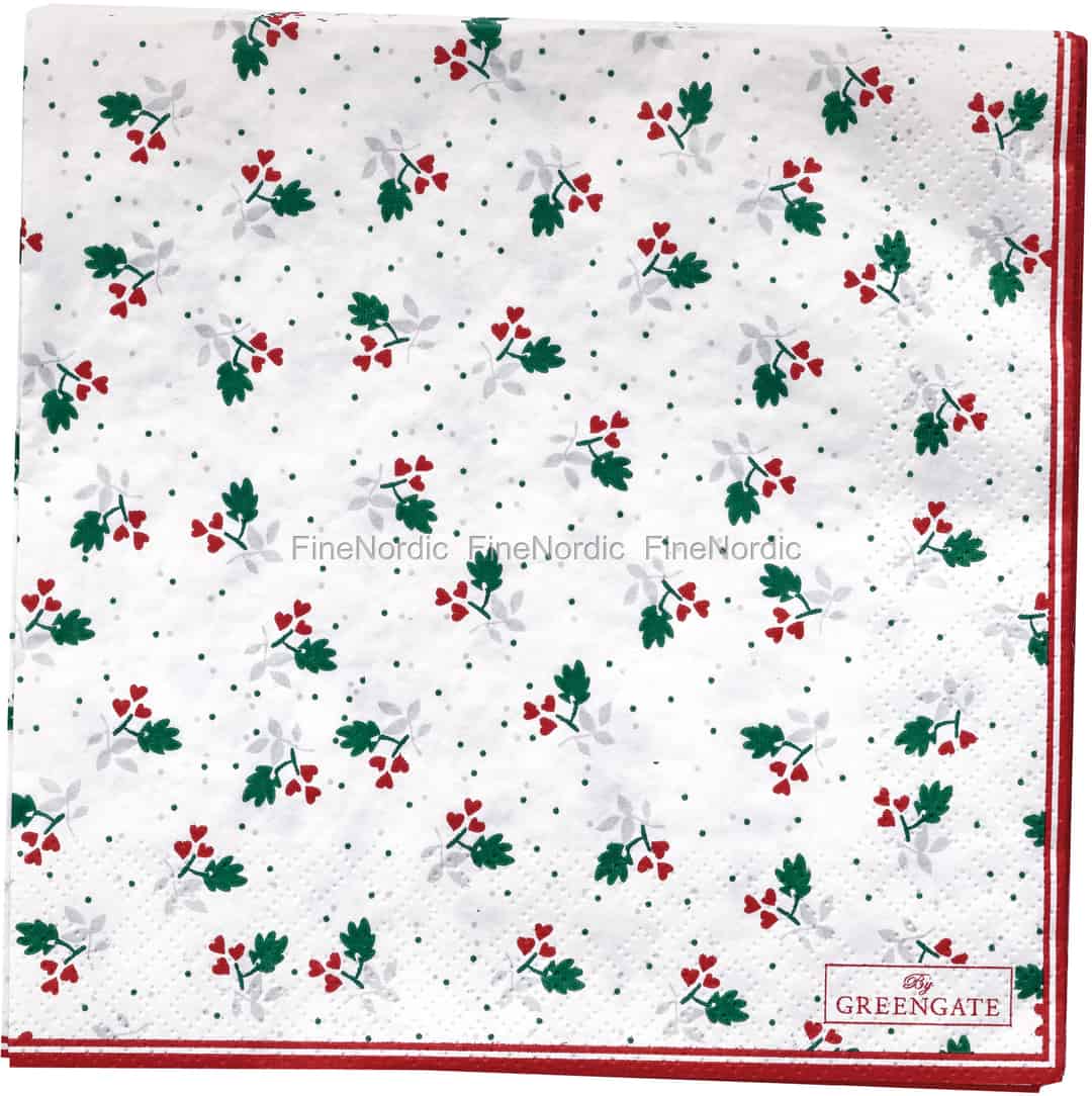 Das Joselyn White Muster, besteht aus traditionellen roten und grünen Weihnachtsfarben, welche auf dem weißen Hintergrund dieser Papierservietten einfach fantastisch aussehen. Dieses GreenGate Design kann als sich wiederholendes Muster von drei kleinen roten Herzen an einem blättrigen Zweig beschrieben werden. Ein schöner, roter Rand umrahmt die Papierservietten und sie werden im 20er Pack geliefert. Sie eignen sich perfekt für ein kleines Beisammensein mit Freunden, eine Cocktailparty oder auch einen Brunch in der Weihnachtszeit. Sie sind dazu auch ein schönes Gastgeschenk in der Adventszeit. Schauen Sie sich gerne mal all die schönen Joselyn Produkte an, die wir hier in unserem Webshop anbieten.