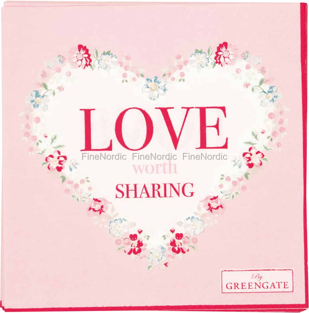 Die kleinen, rosafarbenen Papierservietten Love White von GreenGate werden in der Mitte mit einem weißen, von Blumen umrankten Herz geschmückt, in dem die Worte Love worth sharing stehen. Dies ist sehr passend zu GreenGates Motto: Moments worth sharing. Die Servietten werden von einer roten Kante eingerahmt und das GreenGate Label ist auch zu sehen. Die kleinen Servietten kann man mit der Stoneware aus vielen GreenGate Geschirrserien kombinieren. Die 20 Servietten haben die perfekte Größe für wenn Sie Ihren Gästen Fingerfood oder kleine Häppchen servieren wollen.