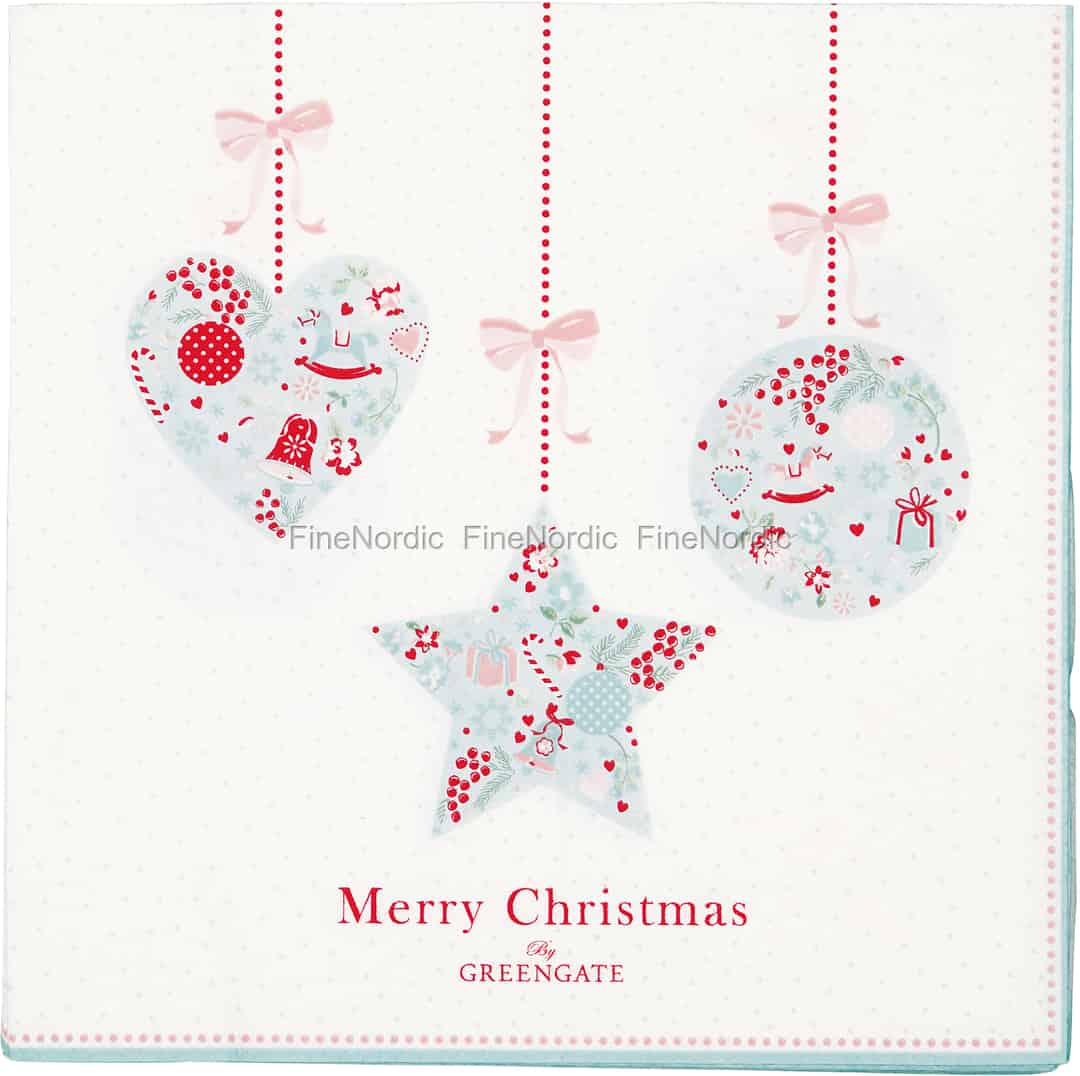 Die weißen Papierservietten Sandie White werden mit Weihnachtsschmuck in hellblau, rot und rosa und mit den, mit roten Buchstaben geschriebenen Worten: Merry Christmas by GreenGate, verziert. Je ein Herz, ein Stern und eine Kugel sind hängend auf der Serviette zu sehen und in ihnen sind verschiedene Weihnachtsmotive abgebildet. Glocken, Zweige, Schaukelpferde und noch vieles mehr gibt es auf der Serviette zu entdecken. Die Einwegservietten werden in einem 20er Pack geliefert und mit diesen hübschen Weihnachtsservietten ist der Weihnachtstisch ruckzuck wunderschön gedeckt.