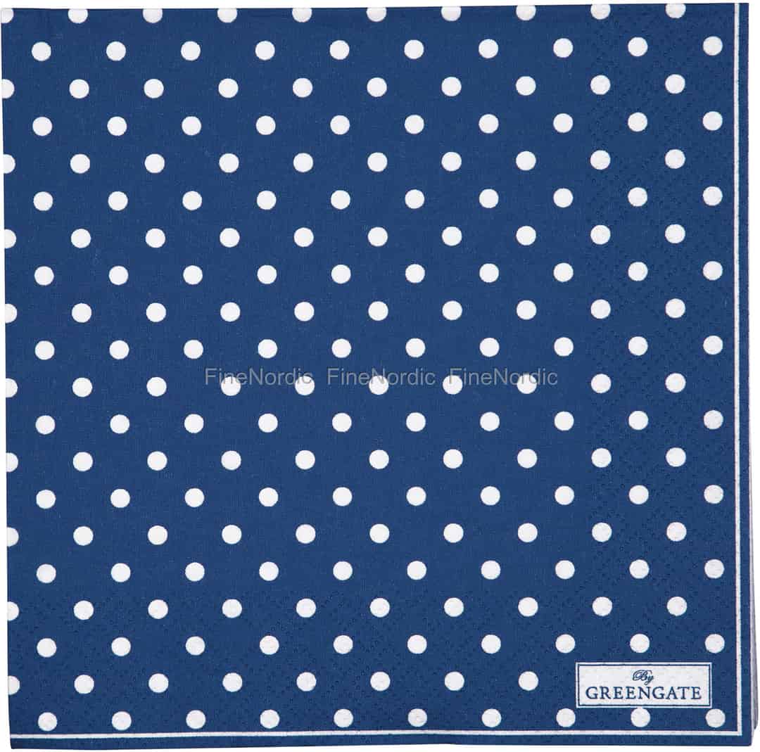 Licht aus ... Spot on! Das ist für dieses Produkt sehr passend, denn wir finden nämlich, dass die GreenGate Papierservietten einfach „spot on“ (genau richtig) sind. Punkte sind immer „in“ und die weißen Punkte auf diesen blauen Servietten schauen einfach sehr schön und fröhlich aus. Bringen Sie mit diesen fantastischen Servietten etwas Farbe auf den Tisch. Sie kommen in einer Packung mit 20 Stück und sind ungefaltet ganze 33 cm x 33 cm groß. Sie werden von einem blau-weiß gestreiften Rand eingerahmt und sind dazu noch mit dem aufgedruckten GreenGate Etikett versehen. Werfen Sie gerne auch mal einen Blick auf die anderen Spot Papierservietten, die wir von dieser Serie anzubieten haben. Sie können sie in lauter verschiedenen Farben in unserem Webshop entdecken.