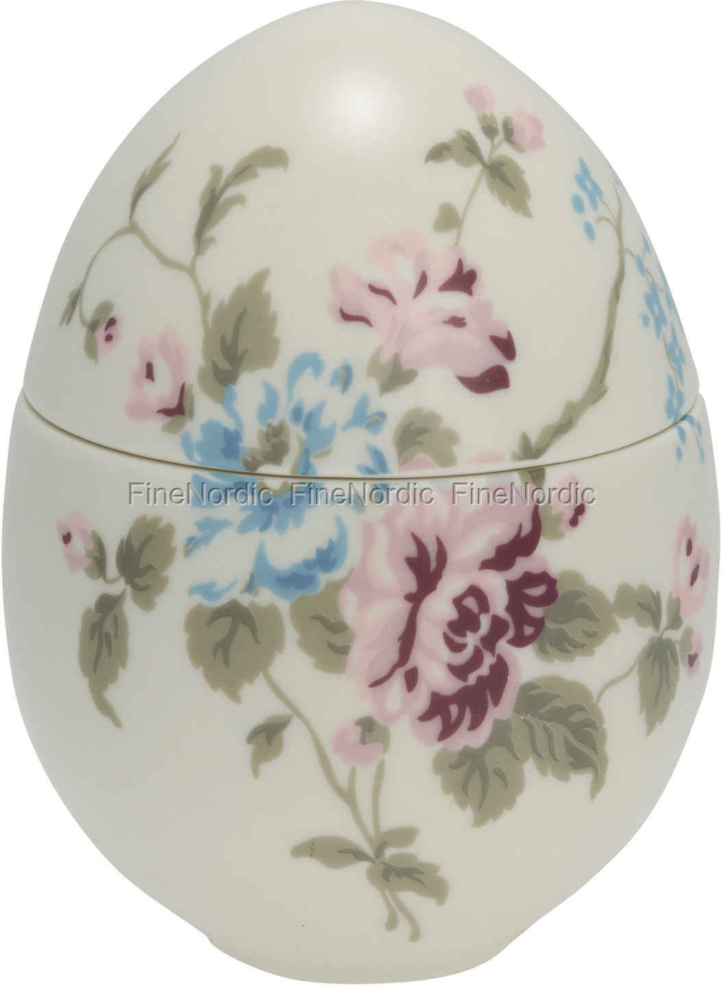 Das Maude White Porzellan Ei von GreenGate dient als Aufbewahrungsplatz für kleine Gegenstände und als attraktive Dekoration. Man kann es an der oberen Hälfte öffnen, sodass man leicht etwas in das Ei legen kann oder etwas rausnehmen kann. Es ist mit einem schönen Blumenmuster geschmückt und das Ei ist 13 cm groß und an seiner breitesten Stelle hat es einen Durchmesser von 9 cm. Füllen Sie es mit ein paar Bonbons und stellen Sie es auf die Küchentheke, so dass es immer in Reichweite ist, wenn der nächste Süßigkeiten Heißhunger kommt. Sie können es auch als hübsche Deko auf das Regal oder die Fensterbank stellen und vielleicht dort ein paar kleine Leckereien darin verstecken. Stellen Sie es im Frühling, zu Ostern und auch das ganze Jahr über zur Schau, denn dieses charmante GreenGate Porzellan Ei sieht immer gut aus, egal welchen Monat wir gerade haben.