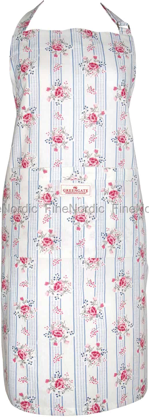 Wer sagt, Schürzen sollten einfach nur praktisch sein? Warum nicht auch gut aussehend? Diese Fiona Pale Blue Schürze von GreenGate kann all das und noch viel mehr. Sie ist leicht an- und auszuziehen, sie schützt Sie beim Kochen und Backen vor Klecksen und Flecken, hat vorne eine praktische Tasche aufgenäht, in der Sie Rezeptkarten oder kleinere Küchenutensilien aufbewahren können, und sie sieht dazu auch noch einfach fantastisch aus. Bunte Blumensträuße zieren den blau-weiß gestreiften Hintergrund der Schürze und das bekannte GreenGate Label schmückt die Fronttasche. Die Schürze besteht aus 100% Baumwolle und ist bei 40 ° C waschbar. Also, wenn Sie bereit sind, Ihre alte, langweilige Schürze durch eine neue auszutauschen, dann sehen Sie sich doch mal all die wunderschönen GreenGate Schürzen an, die wir hier in unserem Webshop anbieten. Eine adrette GreenGate Schürze wäre vielleicht auch eine nette Geschenkidee für den berühmt-berüchtigten Bäcker oder Koch in Ihrem Freundeskreis.