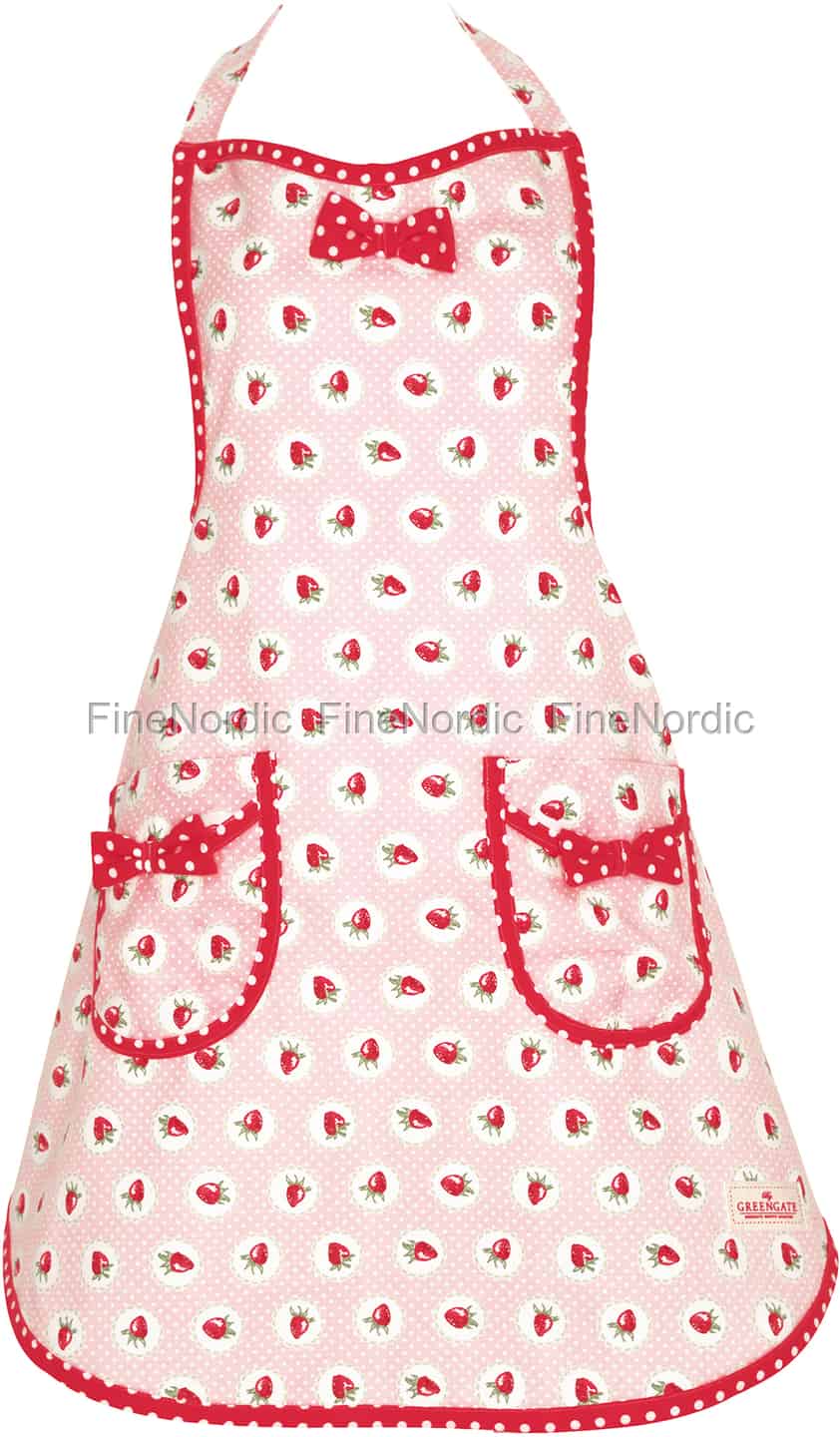 Die Strawberry Pale Pink Schürze von GreenGate sieht nicht nur fantastisch aus, sie verbreitet auch gute Laune, dank ihres hübschen Musters und Designs. Der rosa Vorbinder ist mit weißen Pünktchen verziert und dazu auch mit vielen weißen Kreisen, in dem je eine rote Erdbeere zu sehen ist. Die zwei vorderen Taschen, sowie auch der Rand der Schürze, sind mit einer roten, weißgepunkteten Bordüre versehen und die roten, weißgepunkteten Schleifen in der oberen Mitte der Schürze und auf den beiden Taschen, geben der Baumwollschürze ihren letzten Schliff. Mit GreenGates Strawberry Pale Pink Schürze geht die Küchenarbeit leicht von der Hand und mit der attraktiven Schürze kann man sich sogar auch beim Servieren im Esszimmer gut vor den Gästen sehen lassen.