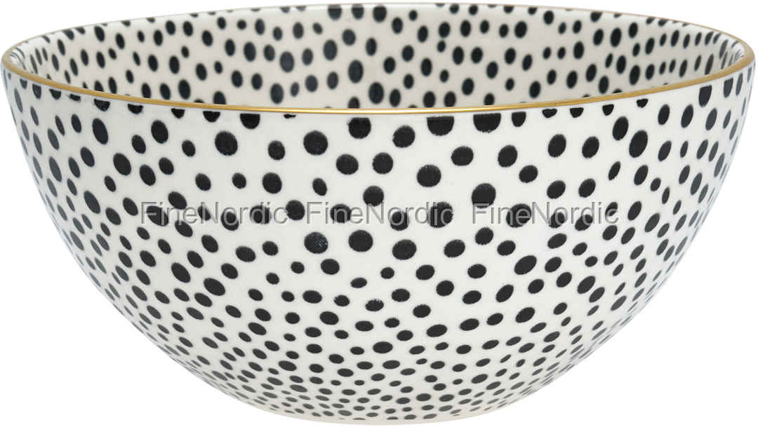 Die gepunktete Schüssel Dot Black mit Gold von GreenGate ist ein herrlicher Blickfang auf dem Tisch. Ganz egal ob mit etwas Obst gefüllt, mit saisonaler Deko bestückt, oder auch ganz leer, sie wird sofort die Aufmerksamkeit auf sich ziehen. Die stilvolle weiße Porzellanschale ist mit vielen kleinen schwarzen Punkten bedeckt und entlang der oberen Kante ist eine goldfarbene Linie zu sehen. Sie können Sie als Suppenschüssel oder für Ihre Frühstückscerealien verwenden und sie eignet sich auch als kleine Servierschale oder Snackschüssel. Dank ihrer schwarz-weißen Schlichtheit und der schicken goldenen Borte kann sie auch gut mit Stoneware aus anderen GreenGate Serien kombiniert werden. Punkte liegen immer voll im Trend und somit auch diese zeitlose Schönheit von GreenGate.