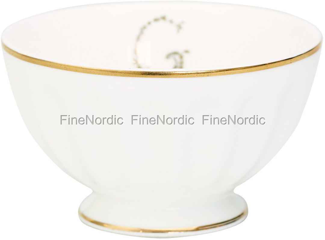 GreenGates Schale French bowl G Gold überzeugt mit seiner klassischen Schönheit: Weißes Porzellan mit Goldkante. Wenn Sie Ihren Gästen die Schale befüllt reichen, werden sie erst nach und nach das G in Form einer Blumenranke in der Innenseite der Schale entdecken. Eine nette, kleine Überraschung in GreenGate Stil.