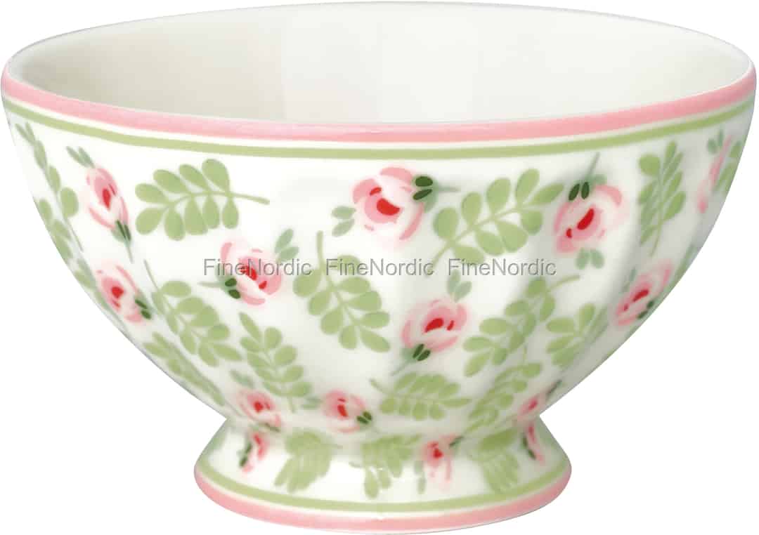 Die Lily Petit White French Bowl in Medium von GreenGate ist eine wunderbare kleine Snackschüssel. Sie hat eine Kapazität von 150 ml, so dass Sie sie mit ein paar Gemüsesticks oder Obstscheiben füllen können. Die attraktive Schale ist ideal für die, die gerne kleine Portionen essen. Die helle Schale ist außen mit einem schönen Blumenmuster versehen und die Innenseite ist einfarbig. Kleine rosafarbene Rosen und hellgrüne, blättrige Zweige sind Teil des Designs dieser Schüssel. Den oberen und unteren Rand umkreist jeweils eine rosa und eine hellgrüne Linie. Decken Sie einen hübschen Tisch mit ihr und mit den anderen Lily Petit Geschirrteilen von GreenGate. Dieses schöne Muster ist auch auf vielen GreenGate Textilien zu finden. Wenn Sie Interesse daran haben, sich diese anzuschauen, dann können Sie diese alle in unserem Webshop entdecken.