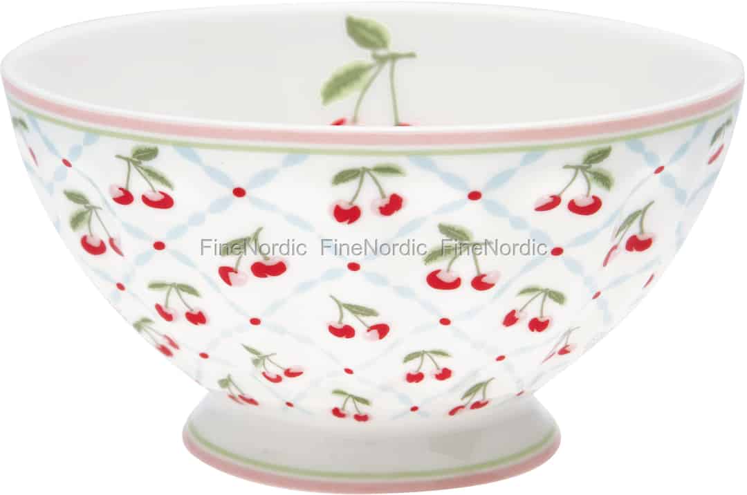 Genießen Sie eine Suppe, einen Salat oder einen Snack aus dieser fröhlichen Cherie White French Bowl von GreenGate. Die XL Schale ist mit roten Kirschen, grünen Blättern und einem rautenförmigen Muster aus roten Punkten und hellblauen Linien verziert. Die Porzellanschale hat ein Fassungsvermögen von 400 ml und ist sowohl spülmaschinen- als auch mikrowellengeeignet. Die French Bowl ist Teil der beliebten Cherie White Serie von GreenGate und Sie können die verschiedenen Geschirrteile gut miteinander kombinieren. Die Cherie White Produkte von GreenGate verleihen dem Tisch Farbe und ein fröhliches Sommergefühl.