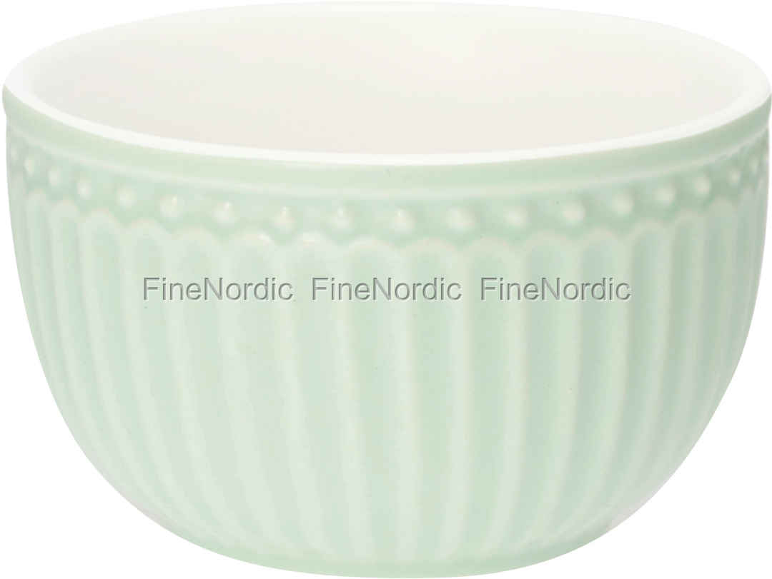 Die kleine Alice Pale Green Mini Schüssel von GreenGate ist an ihrer Außenseite mit einem stilvollen, hellgrünen Relief verziert, was einen tollen Kontrast zu ihrer hellen, glatten Innenseite bietet. Das hellgrüne Schüsselchen kann als Dipschälchen, Soßenschälchen oder auch als Servierschüsselchen für kleine Snacks oder Beilagen, wie Nüsse oder ein paar Oliven, genutzt werden. Die Alice Pale Green Mini Schale kann mit der übrigen Stoneware aus der gleichen Serie kombiniert werden und man kann sie auch gut mit Geschirrteilen aus anderen pastellfarbenen GreenGate Serien mischen.
