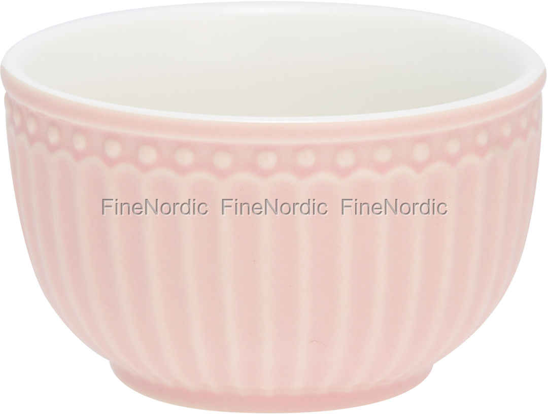 Die kleine Alice Pale Pink Mini Schüssel von GreenGate sieht nicht nur fantastisch aus, sie ist auch vielseitig einsetzbar. Das rosa Schälchen ist an der Außenseite mit einem stilvollen Relief verziert was einen tollen Kontrast zu ihrer hellen, glatten Innenseite bietet. Das rosa Schüsselchen kann als Dipschale für einen leckeren Aioli Dip, oder auch als Soßenschale für z.B. Soja Soße genutzt werden. Auch als kleines Servierschälchen für eine Beilage wie Oliven oder Pimientos macht sie sich perfekt auf dem Tapas Brett. Die Alice Pale Pink Mini Schale kann gut mit der übrigen Alice Pale Pink Stoneware kombiniert werden und auch zusammen mit Geschirrteilen aus anderen pastellfarbenen GreenGate Serien macht sie eine gute Figur. Wie sagt man so schön: Klein, aber oho!
