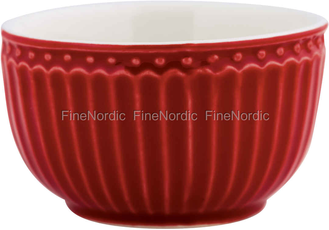Sie lieben die klassische Alice-Serie von GreenGate? Dann ist diese schöne Minischüssel aus namens Alice Red wie gemacht für Sie! Diese niedliche Schale ist schlicht und wird daher zu allem passen und jeden Tisch etwas lebendiger und farbenfroher machen. Servieren Sie einige kleine Snacks in ihr und Ihre Freunde werden begeistert sein. Sie können in der Schüssel auch beispielweise Salz aufbewahre, sodass Sie es griffbereit haben, wenn Sie Kochen.