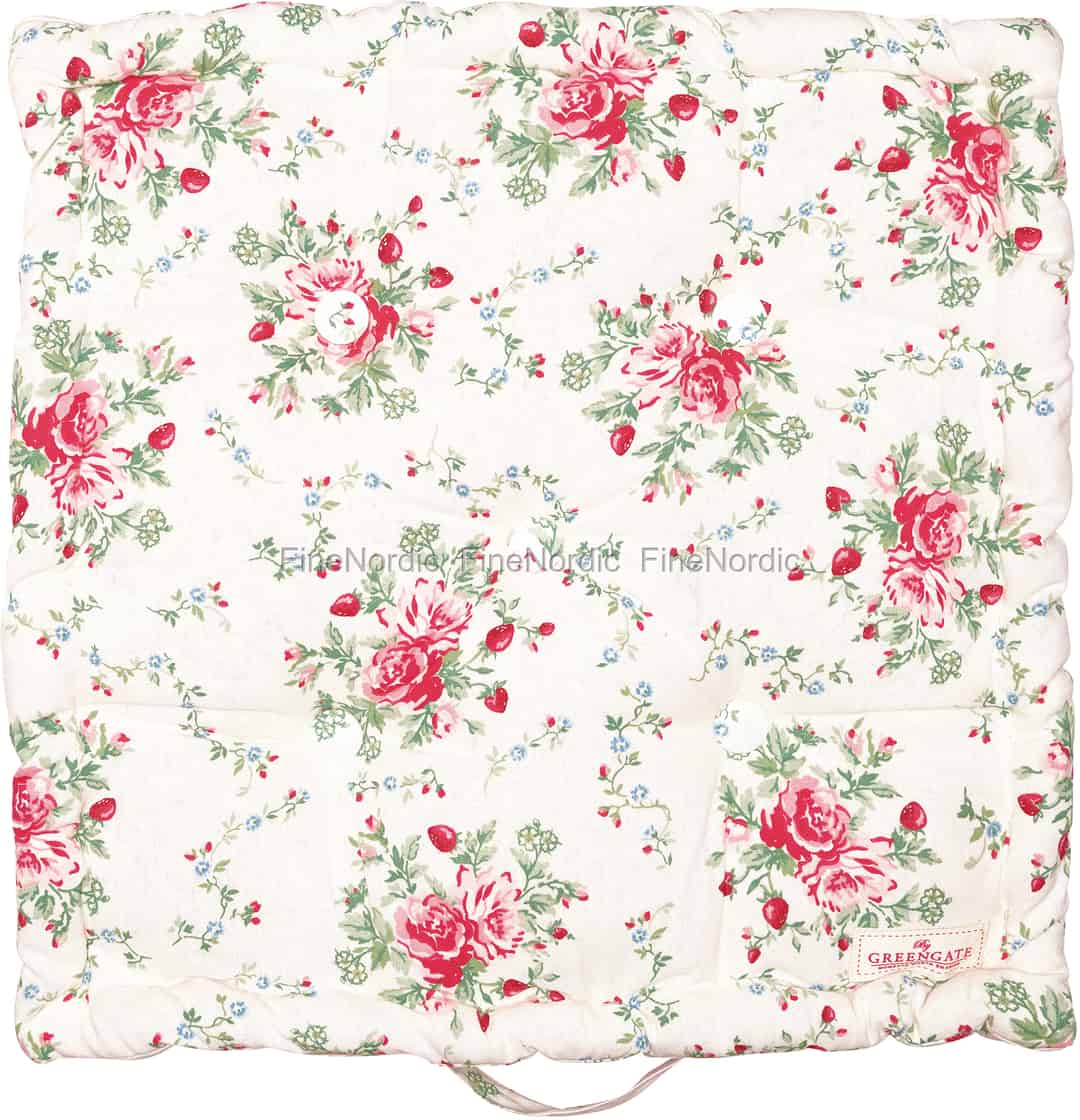 Das Mary White Sitzkissen von GreenGate wird von Rosen in verschiedenen Rottönen, roten Erdbeeren und spielerischen kleinen Blumenranken geschmückt. Die aufgenähten Knöpfe, und das vielen GreenGate Fans‘ vertraute GreenGate Label, tragen außerdem zum schönen Gesamtbild des Sitzpolsters bei. Das quadratische Baumwollkissen kann leicht mit der an seiner Seite angenähten Stoffschlaufe von einem Ort zum anderen getragen werden. Das Sitzkissen sieht nicht nur hübsch aus und ist praktisch, es ist dazu auch sehr bequem und macht das Sitzen auf harten Stühlen oder Bänken gleich viel angenehmer. Sie können das Sitzkissen mit vielen anderen Mary White Produkten kombinieren und auch mit anderen GreenGate Serien lässt es sich gut mischen.