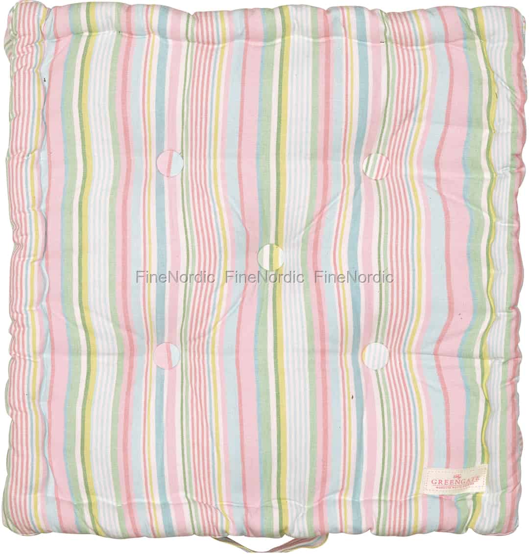 Wir lieben das sommerlich gestreifte Design dieses Pipa GreenGate Sitzkissens. Das Kissen misst 50 cm x 50 cm und garantiert ein bequemes Sitzen auf Ihrem Terrassenstuhl oder -bank. Das Sitzkissen ist mit parallel verlaufenden, pastellfarbenen Streifen verziert und lässt sich durch den angebrachten Tragegurt leicht überall mit hinnehmen. Schauen Sie sich gerne mal die Auswahl an GreenGate Sitzkissen an, die wir in unserem Webshop anbieten.