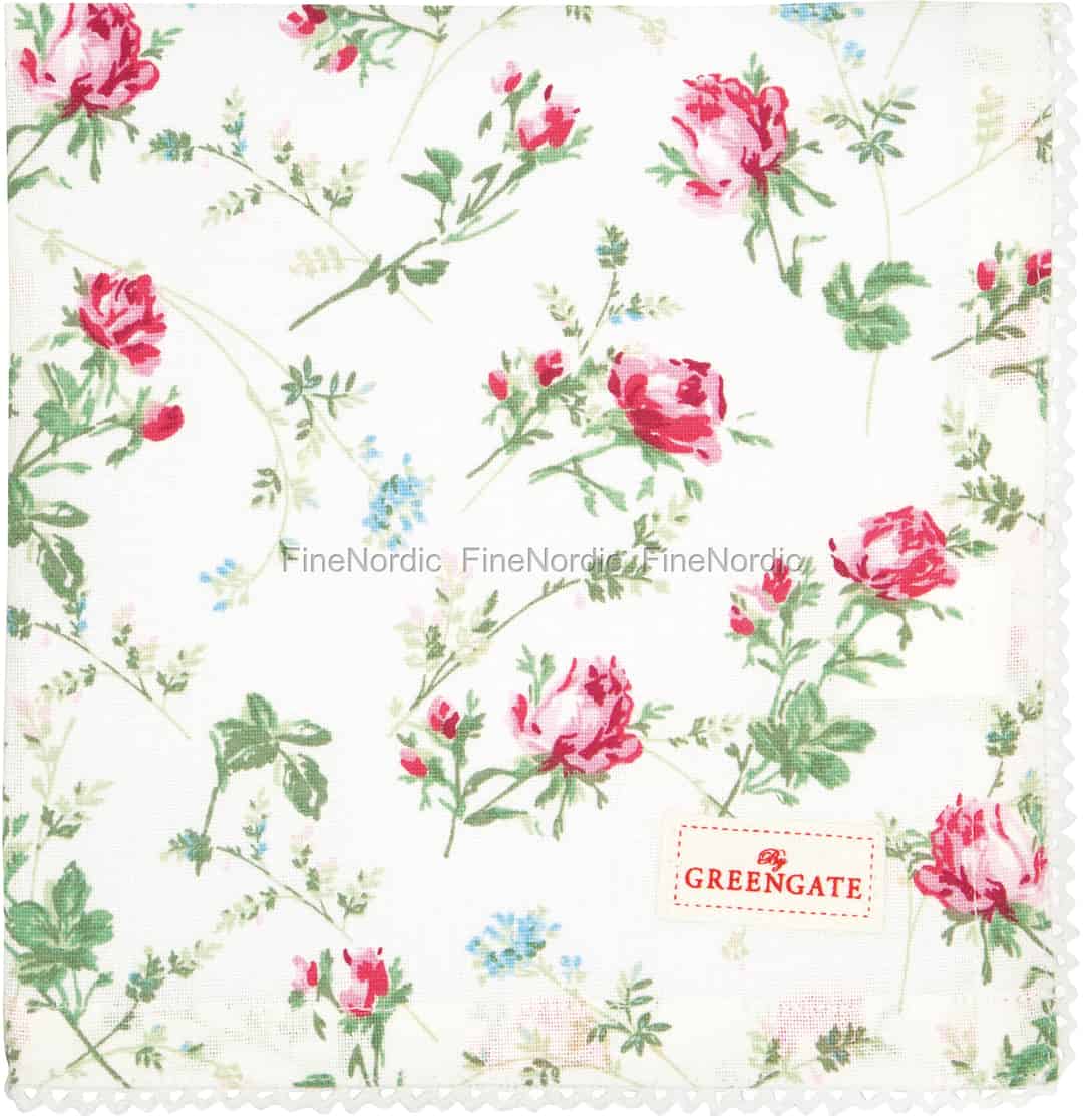 Stoffservietten runden einen festlich gedeckten Tisch ab. Besonders wenn es sich um so hübsche Servietten wie diese handelt. Die Constance White Serviette ist mit einem wunderschönen Rosenmuster bedeckt und von einem eleganten Spitzenrand eingerahmt. Die Baumwollserviette bringt nicht nur Farbe auf den Tisch, sondern ist auch sehr nützlich. Wischen Sie damit kleine Kleckereien auf oder säubern Sie während des Essens den Mund damit. Diese Stoffserviette ist auch sehr nachhaltig und umweltfreundlichen, denn Sie können Sie bei 40 C in der Waschmaschine waschen. So können Sie sie immer und immer und immer wieder verwenden. Die Constance White Stoffserviette kann mit Porzellan aus derselben Serie sowie auch mit Geschirr aus anderen GreenGate Serien kombiniert werden. Die Möglichkeit, die Artikel aus den verschiedenen Serien zu mischen und zu kombinieren, ist einer der Gründe, warum die Geschirrprodukte von GreenGate so beliebt sind.