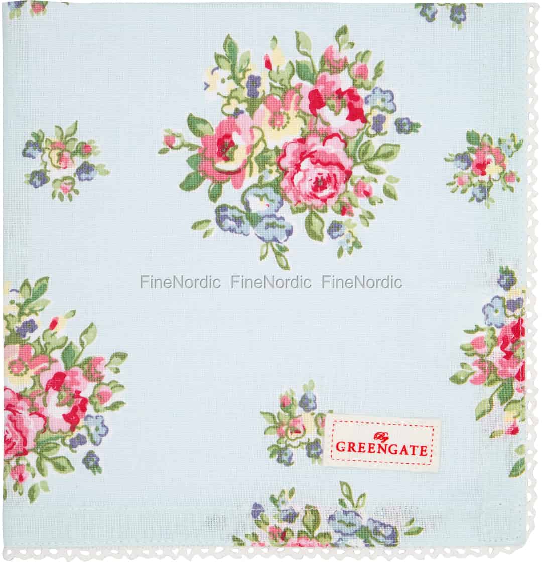 Die Franka Pale Blue Serviette ist mit einem romantischen Blumenmuster verziert, das von einem hübschen Spitzenrand eingerahmt wird und das markante GreenGate Label verleiht ihr den letzten Schliff. Die pastellfarbene Stoffserviette kann sowohl zu den Franka Pale Blue Geschirrteilen als auch zu Porzellan aus anderen GreenGate Serien, wie zum Beispiel der Alice Serie verwendet werden. Die quadratische Serviette besteht aus 100% Baumwolle und kann bei 40 C in der Maschine gewaschen werden. Stoffservietten halten viel mehr aus als Papierservietten und können dazu auch immer wieder verwendet werden. In unserem Webshop finden Sie eine große Auswahl an gut aussehenden Stoffservietten von GreenGate.