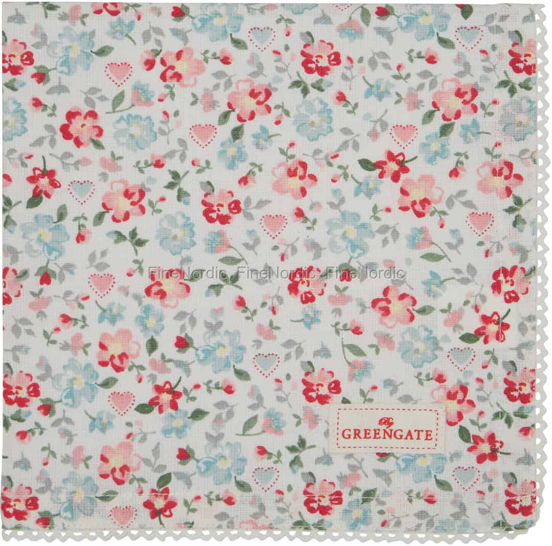 Die Merla White Stoffserviette, aus GreenGates limitierter Zwischensaison Kollektion, ist mit einem bunten All-Over Blumenmuster geschmückt und wird von einer eleganten Spitzenborte eingerahmt. Das pastellfarbene Blumenmuster der hochwertigen Baumwollstoffserviette ist mit zarten Blümchen in Rot-, Blau- und Grüntönen verziert und zwischendrin sind hellblaue und rosa Herzchen zu sehen. Stoffservietten sind sehr nützliche Homeaccessoires, denn sie können vielseitig verwendet werden. Man deckt mit ihnen den Tisch festlich ein, man kann mit ihnen Körbe oder Tabletts auslegen und auch als provisorisches Tischset machen sie sich gut. Die zauberhafte Merla White Stoffserviette aus dem Hause GreenGate kann all das und noch viel mehr und sieht dazu auch noch verdammt gut aus. Die Merla White Stoffserviette von GreenGate ist, wegen limitierter Auflage, nur kurzzeitig erhältlich.
