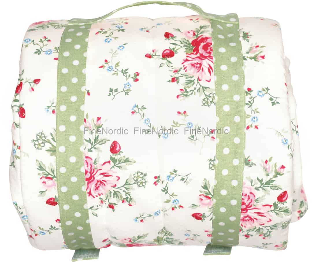 Wer behauptet denn, dass eine Strandmatte Sie nur zum Strand begleiten darf? Was ist mit dem Park, dem Freibad, dem See oder dem Garten? Die attraktive Strandmatte Mary White von GreenGate begleitet Sie gerne zu allen Ihren Lieblingsplätzen im Freien. Auf der einen Seite hat sie ein wunderschönes Rosen- und Erdbeermuster und auf der anderen Seite ist sie mit einem gepunkteten Muster verziert. Man kann sie ganz einfach zusammenrollen und sie dann am angebrachten Tragegurt tragen. Genießen Sie doch einfach einen schönen Tag im Freien auf dieser komfortablen Strandmatte von GreenGate.