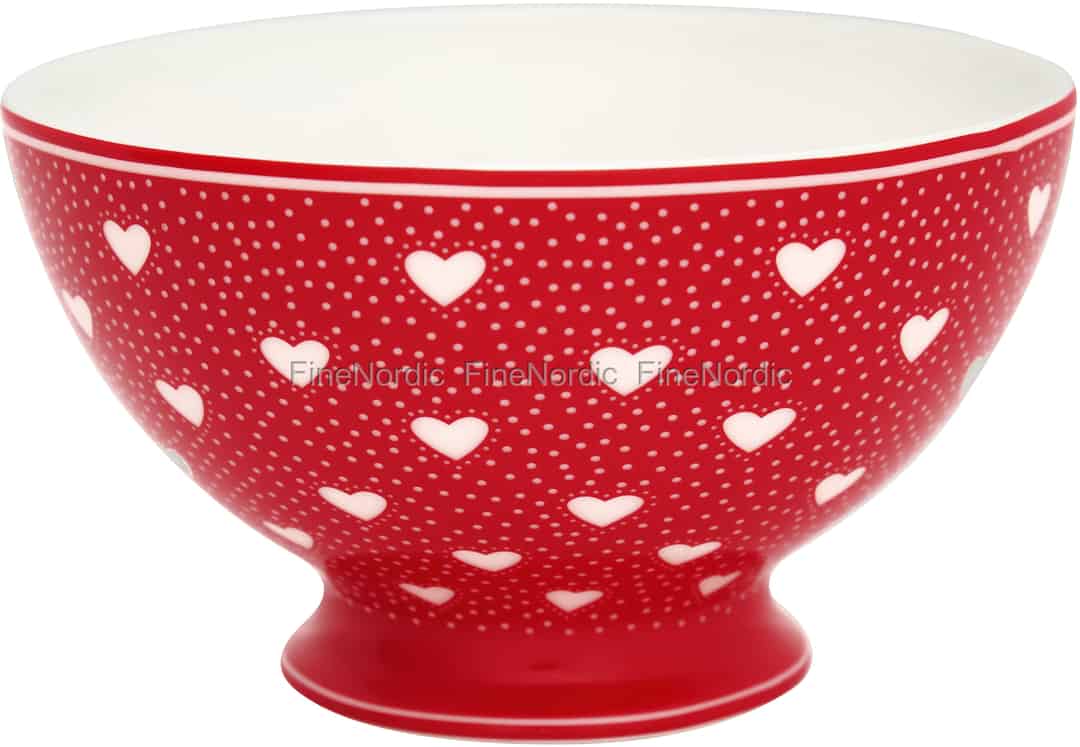 Die Penny Red Suppenschüssel von GreenGate zeichnet sich durch ihre hübsche rote Farbe und das charmante Herzmuster aus. Die Außenseite der Schale ist rot, geschmückt mit weißen Herzen und kleinen weißen Punkten und die Innenseite ist weiß, was einen schönen Kontrast bietet. Genießen Sie Suppe, Eintopf, Salat und vieles mehr aus dieser bezaubernden Porzellanschale. Sie hat eine schöne weihnachtliche rote Farbe, ist aber viel zu hübsch um nur Weihnachten, und nicht das ganze Jahr über verwendet zu werden. Diese runde Schale passt gut zu der anderen Stoneware aus der Penny Red Serie und kann auch ganz toll mit anderen GreenGate Serien gemischt werden, da in vielen von ihnen auch die Farbe Rot zu finden ist.