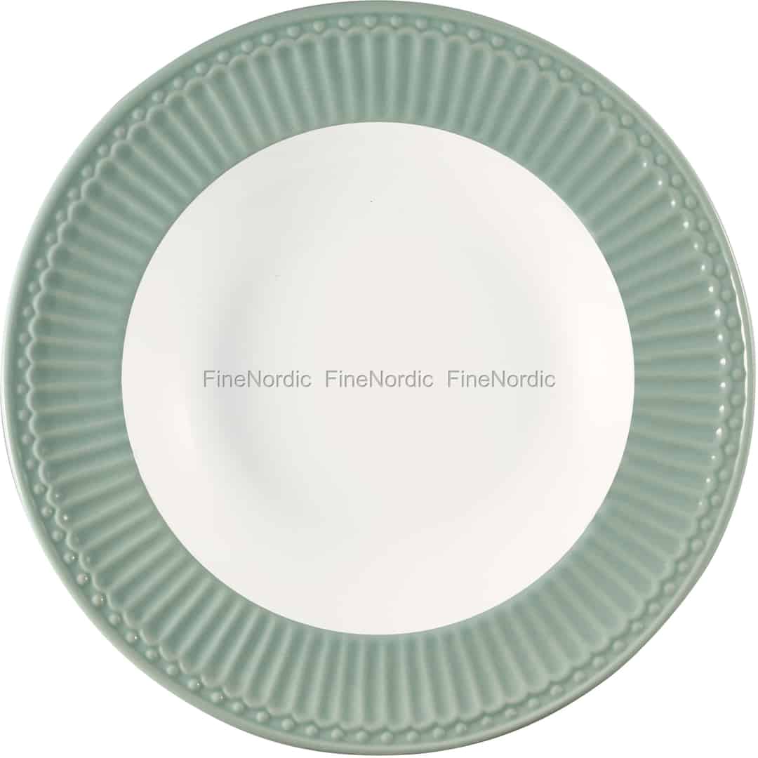 Wir lieben GreenGates wunderschöne Dusty Mint Farbe aus der Alice Serie! Genauso wie Sie sie hier entlang der Kante des Tellers sehen können. Der runde, tiefe Teller Alice Dusty Mint hat eine hellfarbene Mitte und wird von einer gerippten, staubig mintfarbenen Umrandung umgeben. Essen Sie Ihre Lieblingssuppe oder Eintopf aus diesem schönen Teller. Sie können ihn auch mit anderen Farben aus der Alice Serie, oder mit einer gemusterten Serie wie z.B. Josephine Pale Mint oder Josie Mint, kombinieren. Mit GreenGate können Sie Ihren Tisch so bunt oder so schlicht decken, wie Sie es am liebsten mögen.